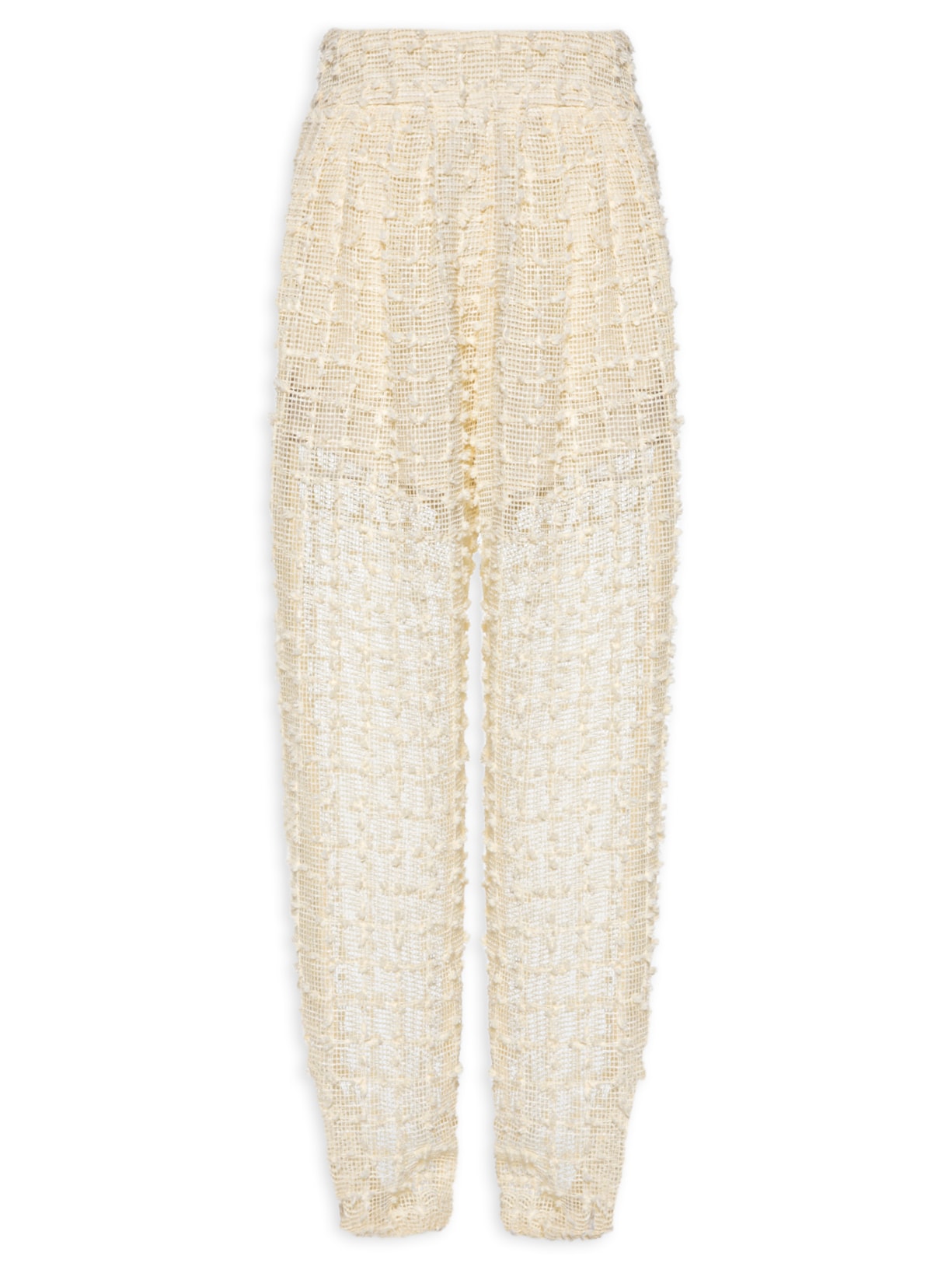 A calça off white é confeccionada em tela com superfície flocada sem elasticidade. A peça solta ao corpo, possui cintura alta, cós largo com elástico embutido na parte posterior, pregas frontais, bolsos faca frontais, elástico embutido na barra, padronagem xadrez, transparência, comprimento cropped*, forro curto e fechamento lateral por zíper metálico.