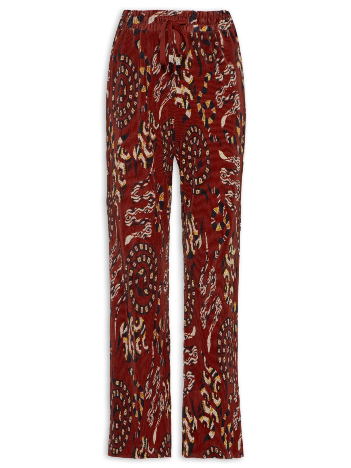 A calça vermelha é confeccionada em tecido leve com alta elasticidade. A peça solta ao corpo possui cintura média, elástico embutido no cós e cordão embutido, estampa cobra-coral e comprimento longo.