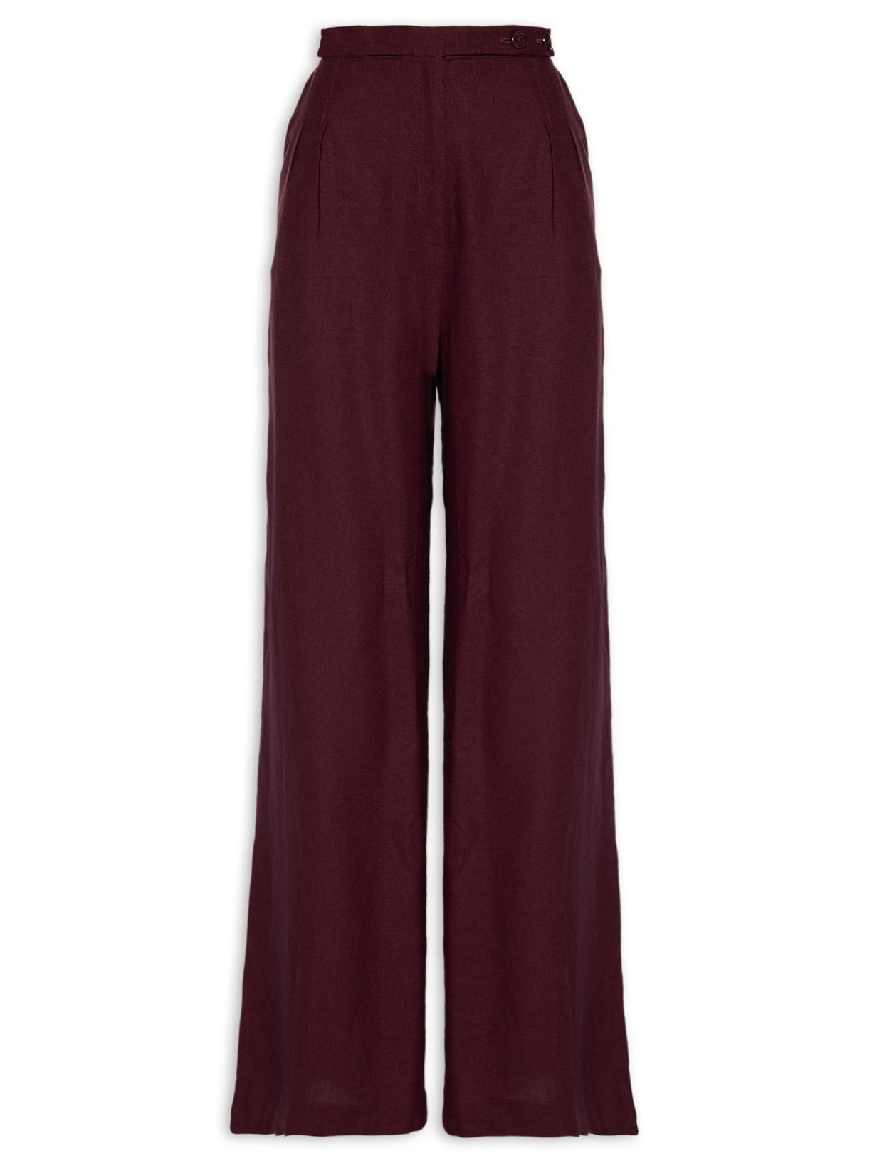 A calça vinho é confeccionada em linho misto. A peça possui cintura alta, bolsos frontais de modelo faca, pregas frontais, pences posteriores, bolsos posteriores embutidos, comprimento longo, shape solto, caimento reto, shape solto, caimento reto, acabamento pespontado e fechamento frontal por botões e zíper.