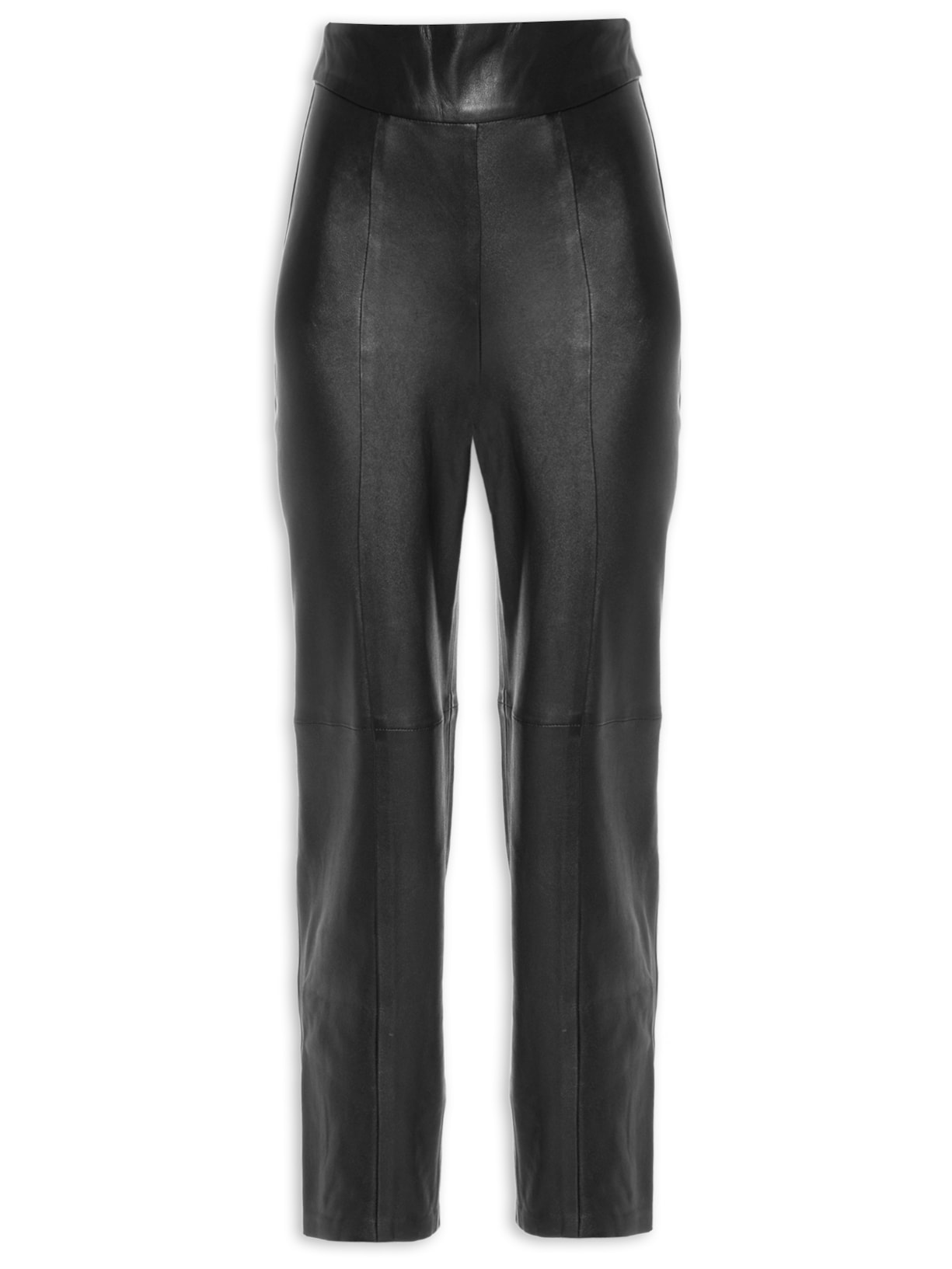A calça preta é confeccionada em couro caprino. A peça de modelo possui cintura alta, recortes frontais e posteriores, comprimento cropped*, shape solto e fechamento lateral por zíper.