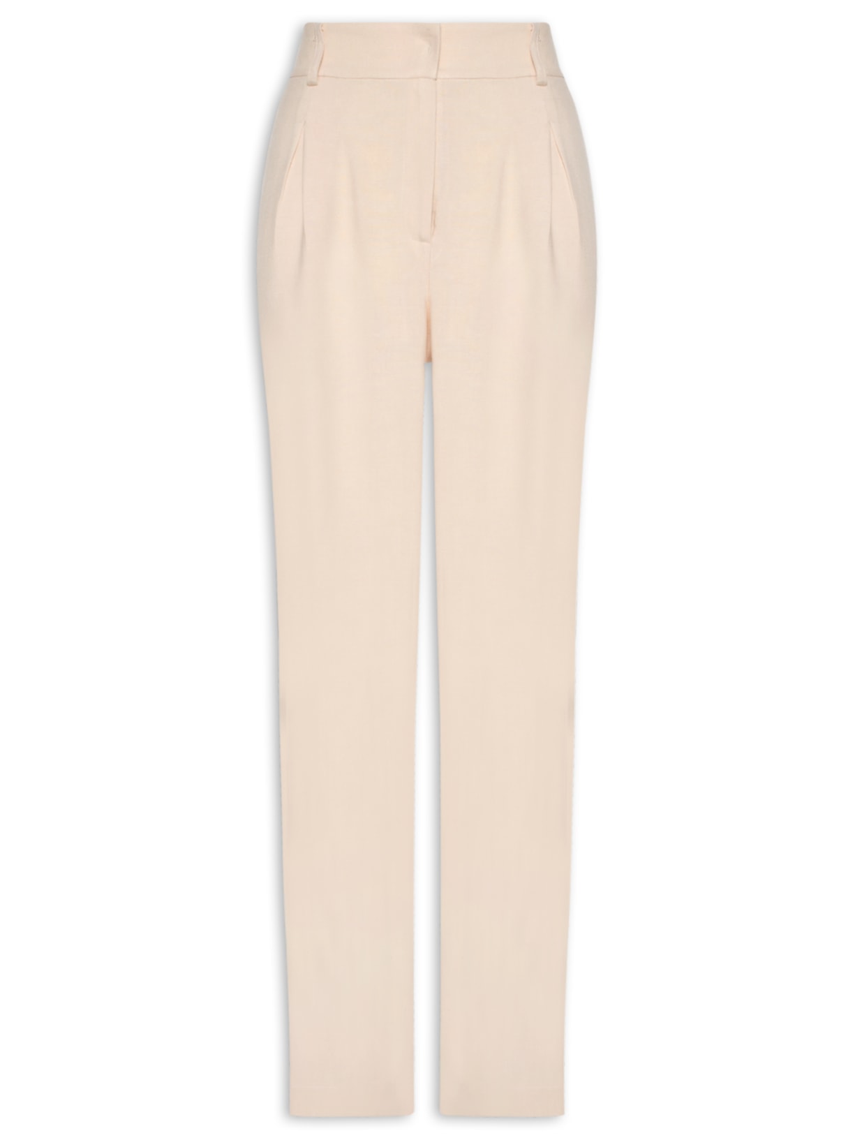 A calça bege é confeccionada em tecido leve com toque de linho sem elasticidade. A peça solta ao corpo, de modelagem reta, possui cintura alta, cós com passantes aplicados e elástico embutido na parte posterior, bolsos faca frontais, pregas frontais, bolsos posteriores, comprimento longo e fechamento frontal por zíper, colchete e botão interno.