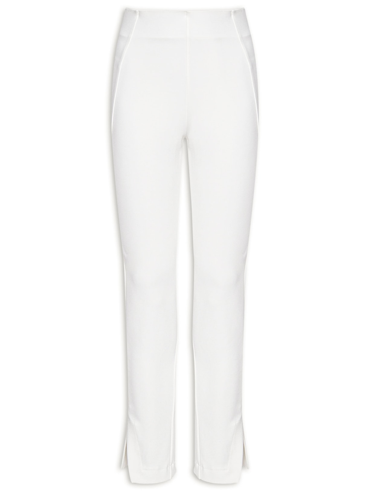 A calça branca é confeccionada em malha estruturada. A peça possui cintura alta, cós elástico, recortes frontais e posteriores no comprimento, pequenas fendas na barra, shape justo, caimento reto, acabamento pespontado e fechamento posterior por zíper metalizado.