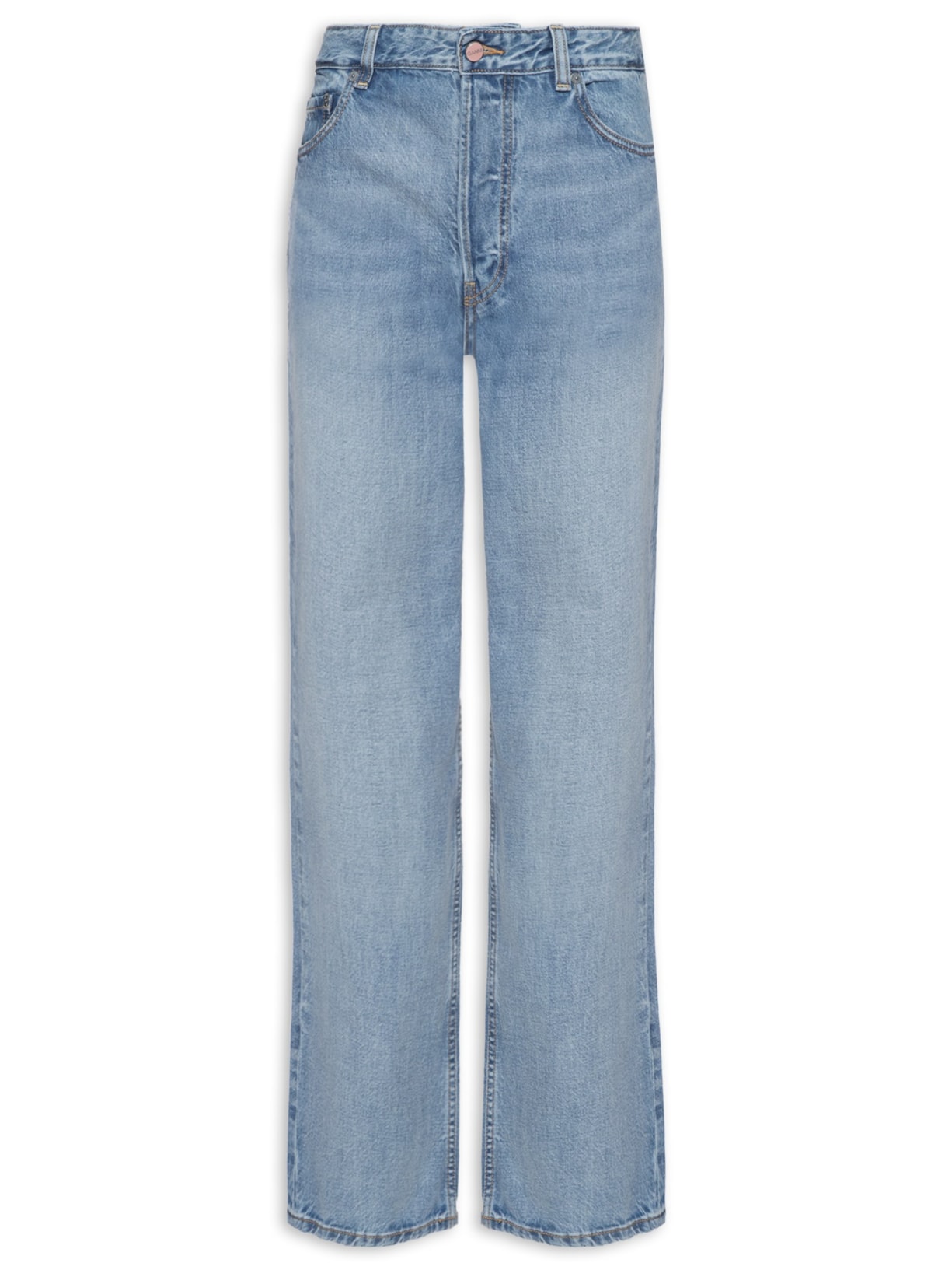 A calça azul é confeccionada em sarja com lavagem jeans e sem elasticidade. A peça solta ao corpo possui cintura alta, cós com passantes aplicados, five pockets*, tag da marca bordada na parte posterior em tons contrastantes, efeito estonado, comprimento longo e fechamento posterior em botões.