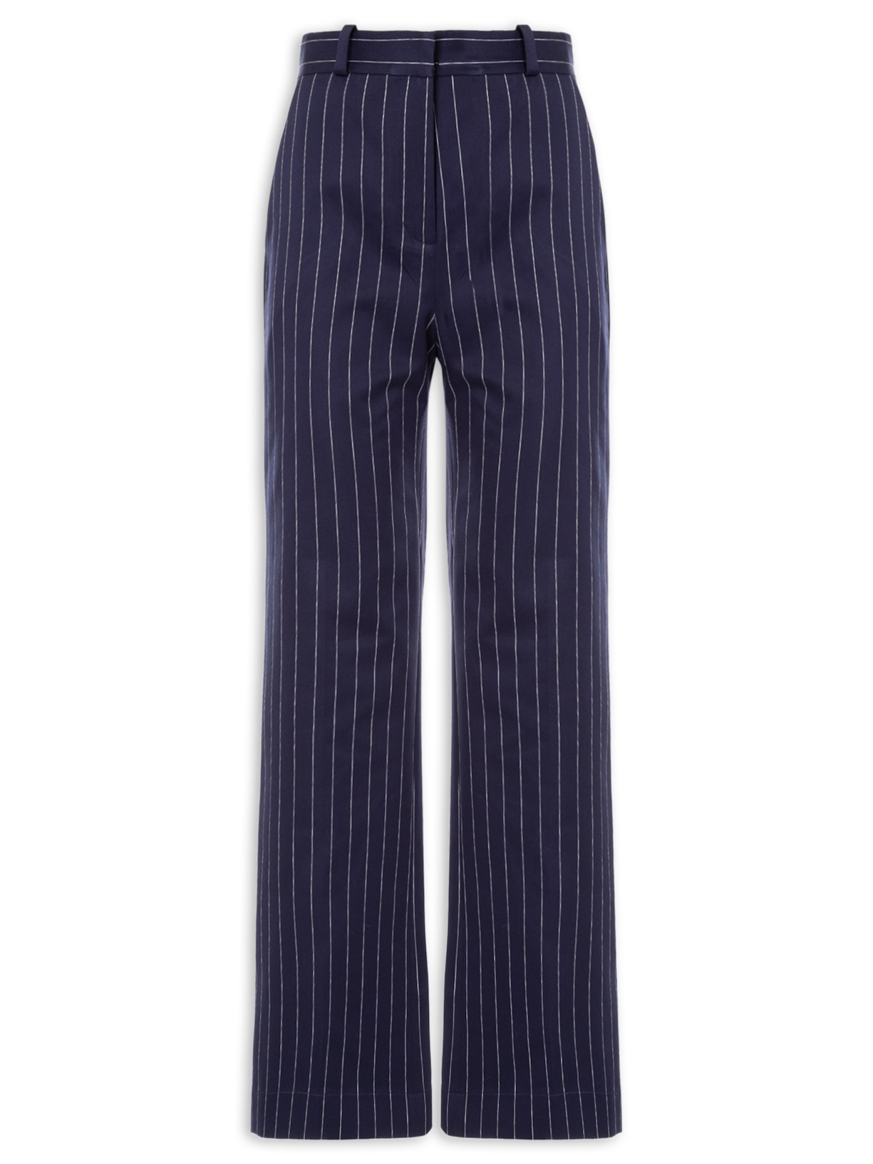 A calça azul marinho é confeccionado em tecido encorpado sem elasticidade. A peça solta ao corpo possui cintura alta, cós com passantes, bolsos frontais modelo faca, bolsos posteriores embutidos, padronagem risca de giz na cor branca, comprimento longo e fechamento frontal por colchete e zíper.