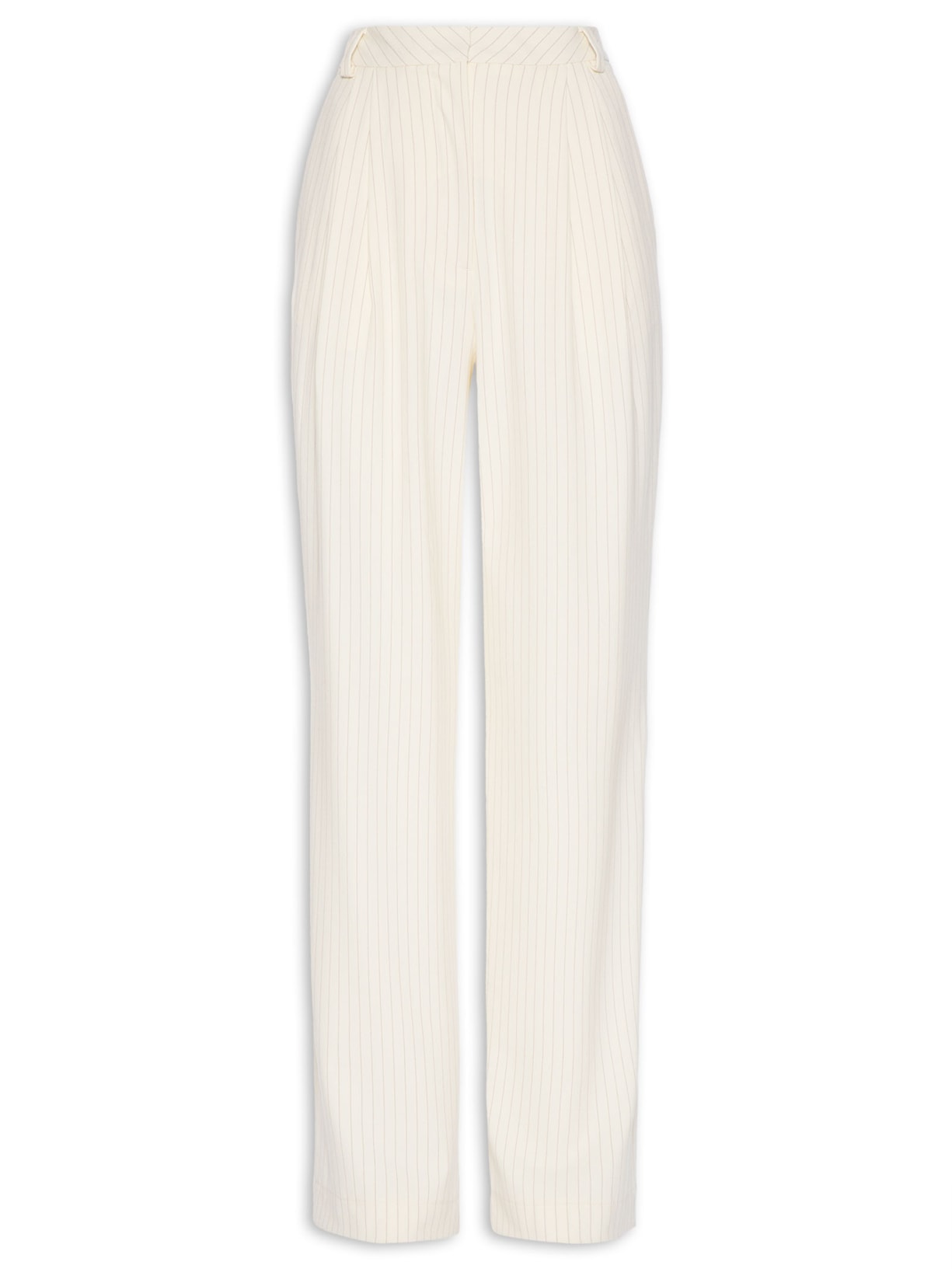 A calça bege é confeccionada em tecido leve de baixa elasticidade. A peça solta ao corpo possui cintura alta, cós com passantes aplicados, bolsos frontais de modelo faca, bolsos posteriores decorativos, pregas frontais, pences posteriores, barra estendida, padronagem risca de giz em tom contrastante, comprimento longo e fechamento frontal em zíper e colchetes.