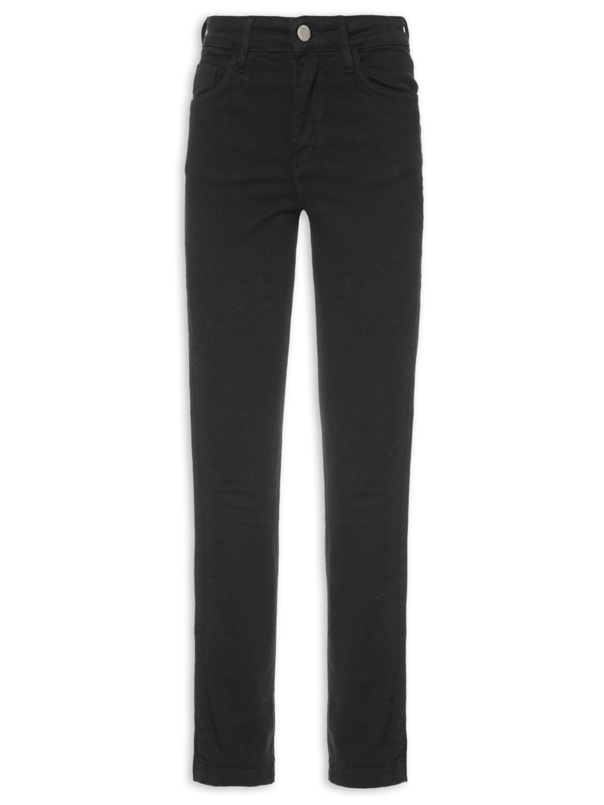 A calça preta é confeccionada em sarja. A peça de modelo skinny* possui cintura média, cós com passantes aplicados, five pockets*, comprimento cropped**, shape justo, caimento reto, acabamento pespontado e fechamento frontal por botão e zíper.