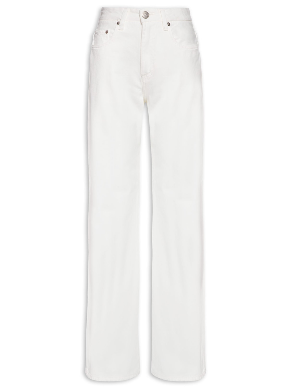 A calça off white é confeccionada em sarja sem elasticidade. A peça solta ao corpo possui cintura alta, cós com passantes, recorte posterior, five pockets* com detalhe de rebites nos bolsos frontais, comprimento longo e fechamento frontal por botão e zíper.