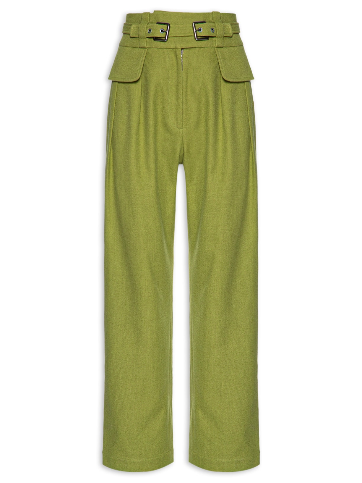 A calça verde é confeccionada em sarja com toque de linho sem elasticidade. A peça solta ao corpo, possui cintura alta, cós largo, com passantes aplicados, detalhe sobreposto nas laterais da cintura, pregas frontais, pences posteriores, comprimento longo e fechamento frontal por zíper metálico e botões internos. Acompanha cinto fino em sarja para uso opcional com fechamento frontal por fivelas metálicas duplas com regulagem.