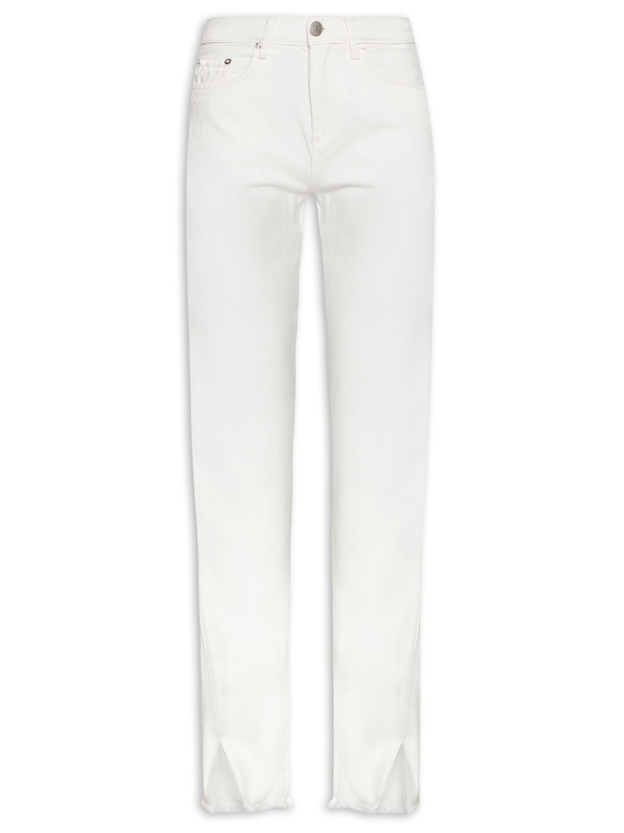 A calça off white é confeccionada por sarja sem elasticidade. A peça solta ao corpo possui cfintura alta, passantes aplicados no cós, five pockets*, recortes posteriores, fendas frontais, barra com acabamento desfiado, fechamento frontal por zíper e botão e comprimento longo.