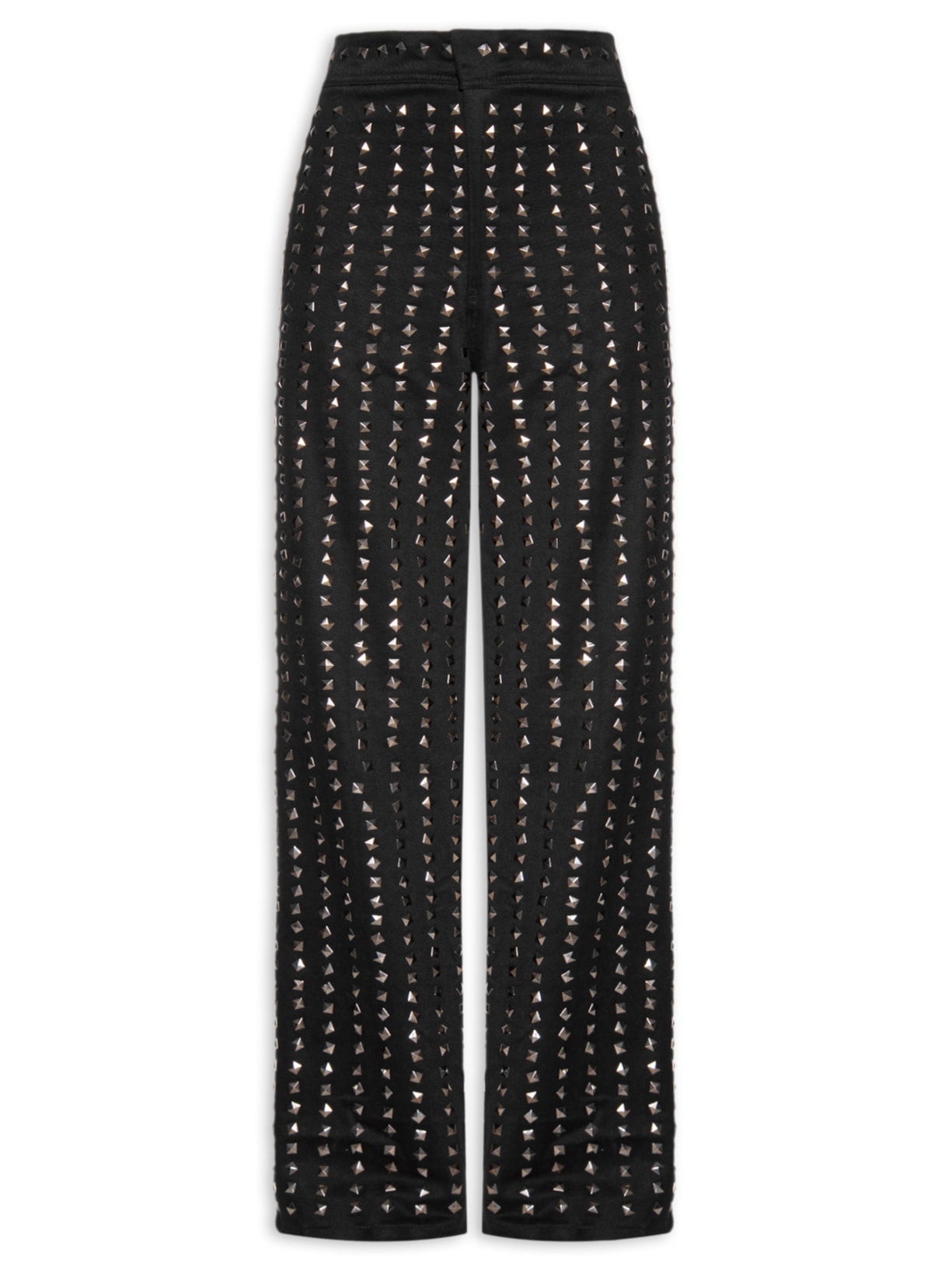 A calça preta é confeccionada em sarja sem elasticidade. A peça solta ao corpo possui cintura alta, bolsos frontais embutidos, pences posteriores, aplicação de spikes metálicos, comprimento longo e fechamento frontal por zíper e colchete.