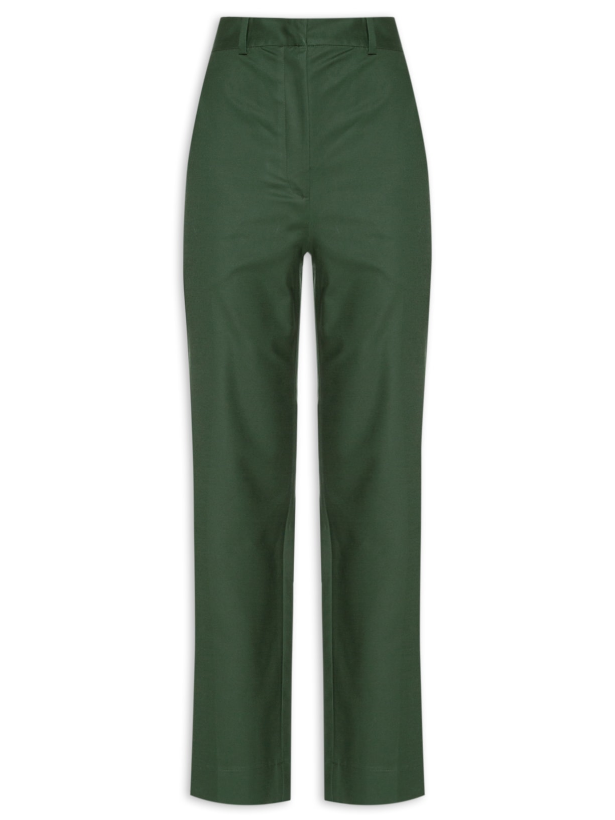 A calça verde é confeccionada em tecido leve com baixa elasticidade. A peça de modelo semi flare* solta ao corpo possui cintura alta, cós com passantes, pences posteriores, bolsos frontais modelo faca, comprimento cropped** e fechamento frontal por colchetes, botão e zíper.