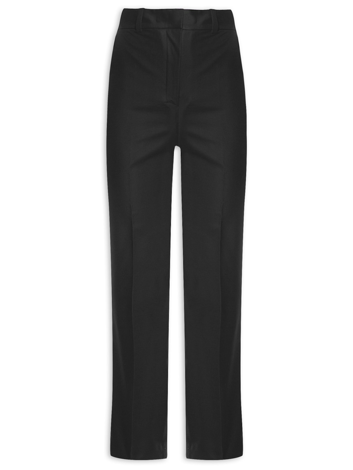 A calça preta é confeccionada em tecido encorpado. A peça de modelo flare* possui cintura alta, cós com passantes aplicados, bolsos frontais de modelo faca, pences posteriores, comprimento cropped**, shape solto e fechamento frontal por colchetes, botão e zíper.
