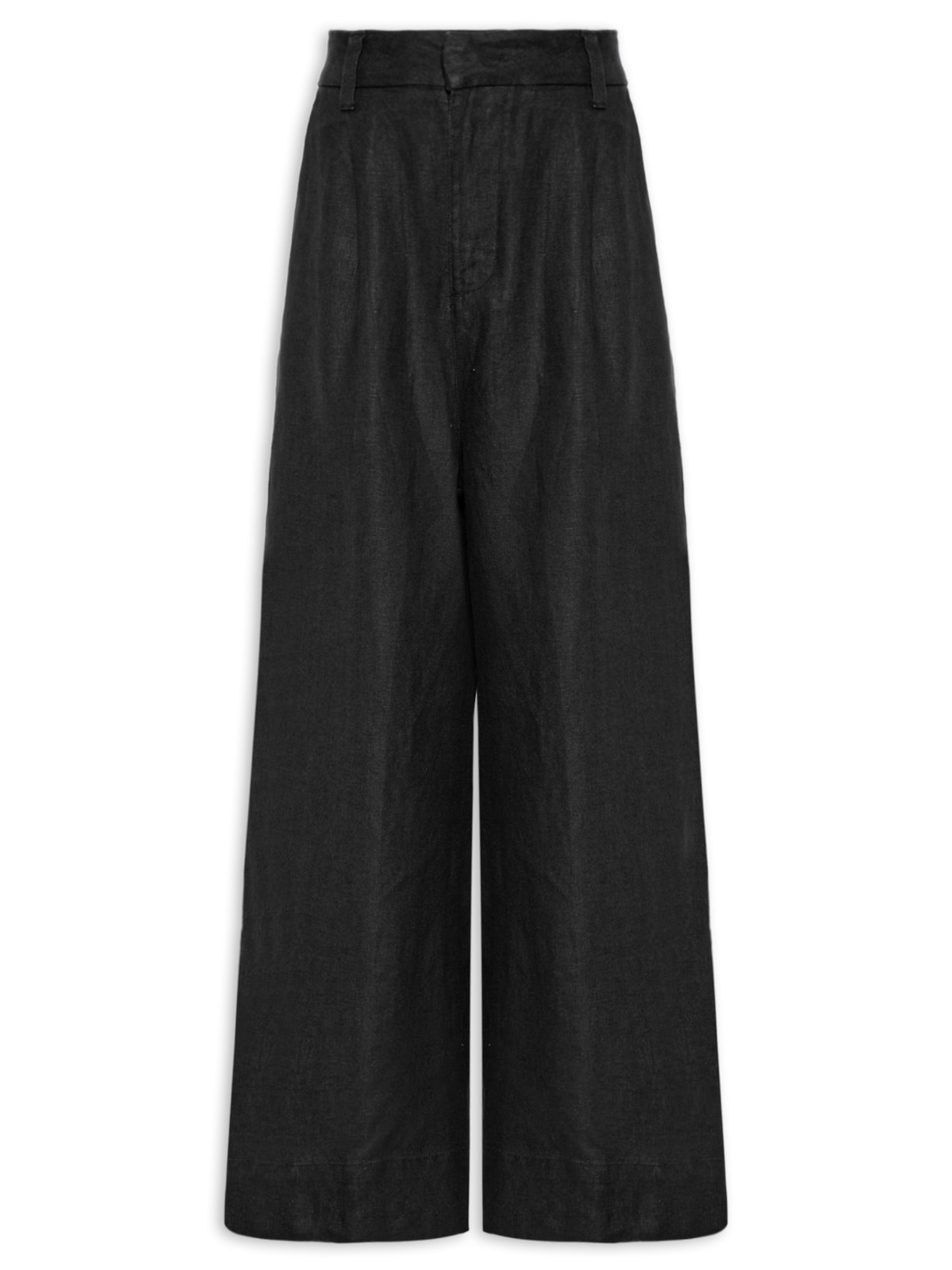 A calça preta é confeccionada em linho sem elasticidade. A peça solta ao corpo, possui cintura alta, cós com passantes aplicados, pregas frontais, bolsos faca frontais, pences posteriores, barra alongada, comprimento longo e fechamento frontal por zíper, colchete e botão interno.