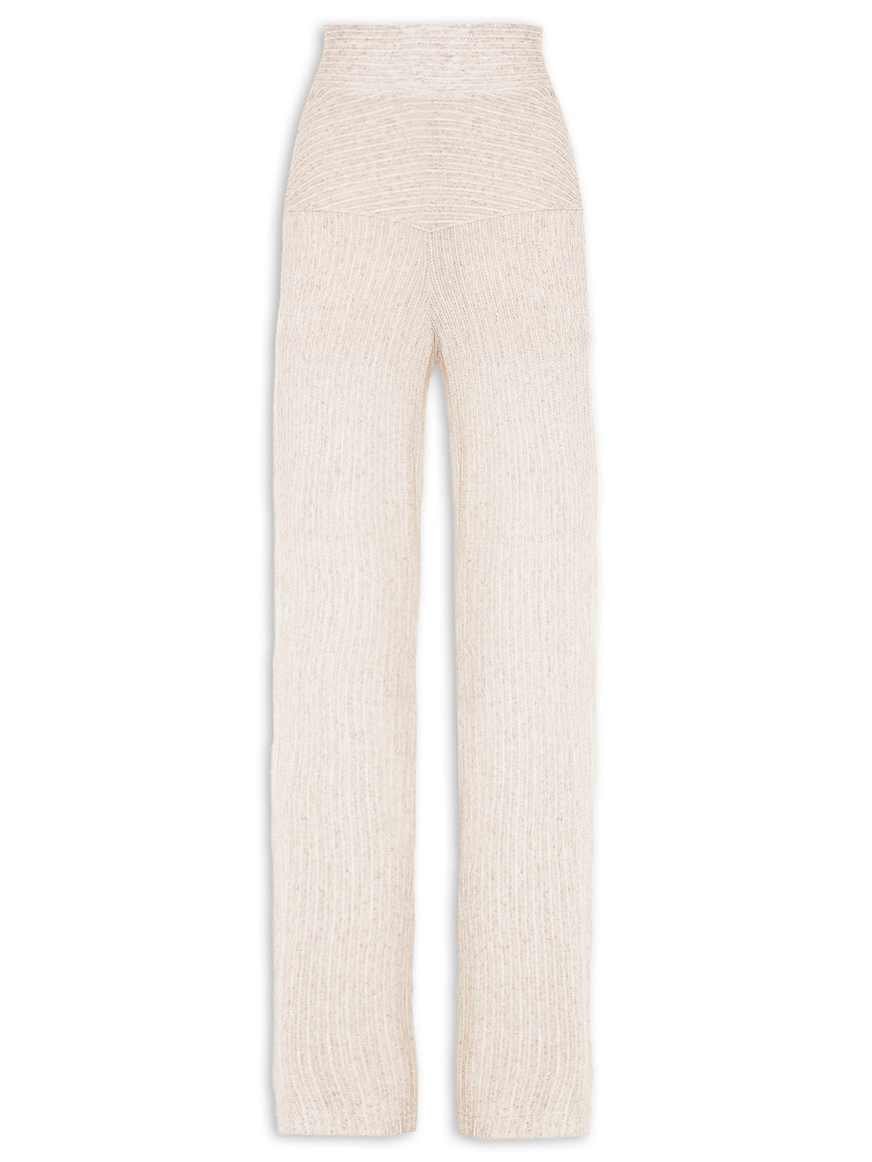 A calça bege é confeccionada em tricot leve com toque de linho e baixa elasticidade. A peça solta ao corpo possui cintura alta, cós amplo com elástico embutido, tag da marca aplicada em metal na parte posterior na altura do cós, recorte posterior e frontal, superfície com fios de lurex na cor dourado, meio forro e comprimento longo.