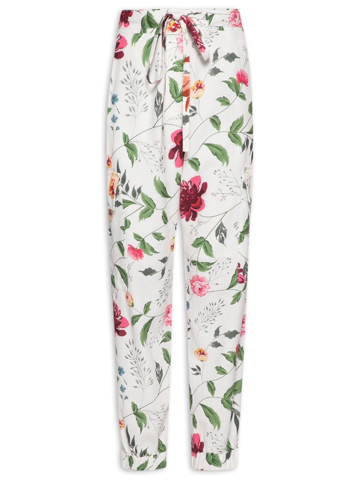 A calça branca é confeccionada em tecido leve com toque de linho sem elasticidade. A peça solta ao corpo, possui cintura alta, cordão embutido no cós para amarração frontal e elástico posterior, bolsos faca frontais, bolsos utilitários laterais com aba, bolsos posteriores, elástico embutido na barra, estampa floral em cores contrastantes, comprimento cropped*, forro curto e fechamento frontal por zíper e botão.