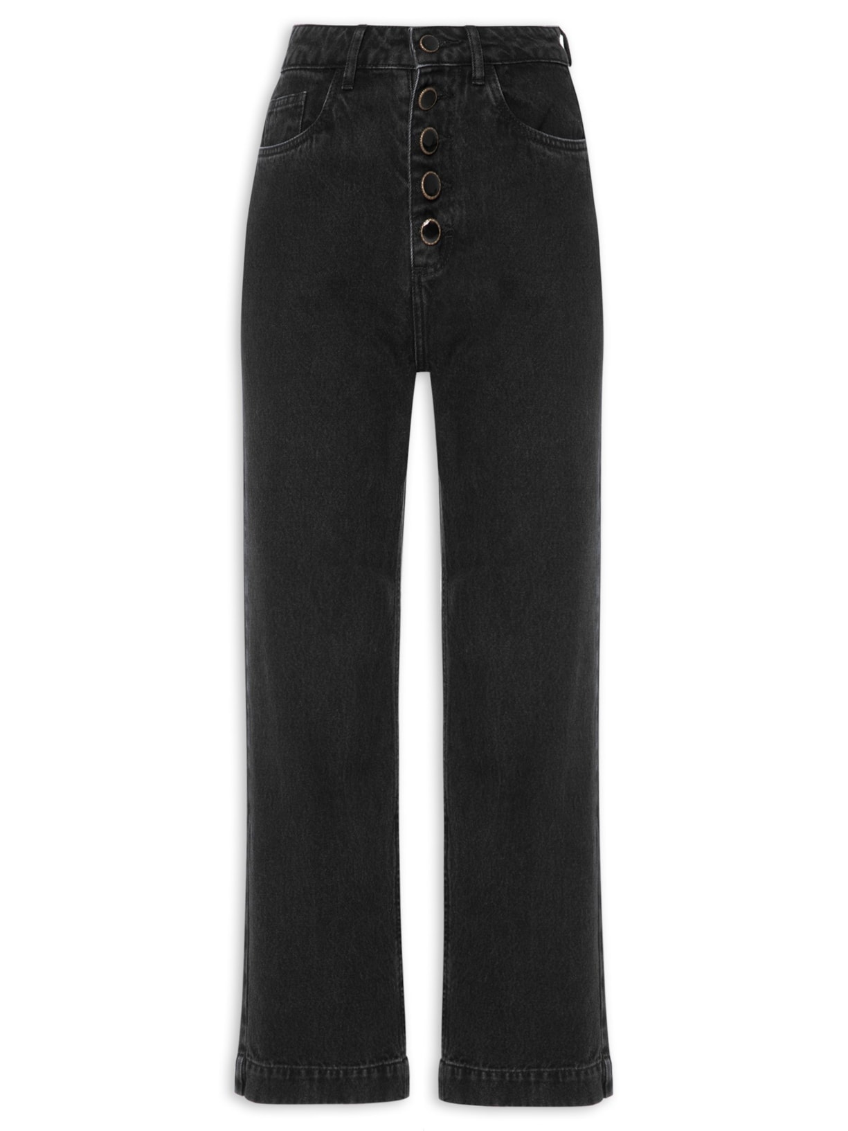 A calça preta é confeccionada em sarja sem elasticidade. A peça solta ao corpo possui cintura média, passantes aplicados no cós, five pockets*, recortes posteriores, fechamento por botões frontais e comprimento capri.