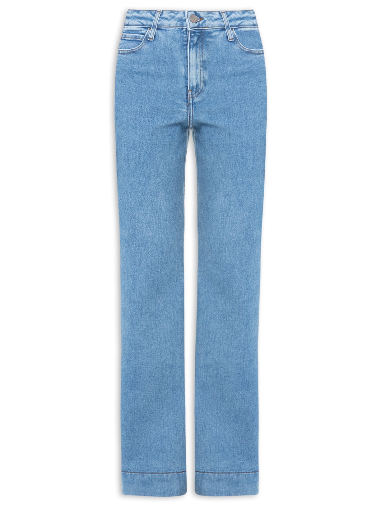 A calça azul é confeccionada em sarja com lavagem em jeans com média elasticidade. A peça solta ao corpo possui cintura alta, cós com passantes, five pockets*, recorte posterior, fendas laterais com fechamento por botões, comprimento longo e fechamento frontal por botão e zíper.
