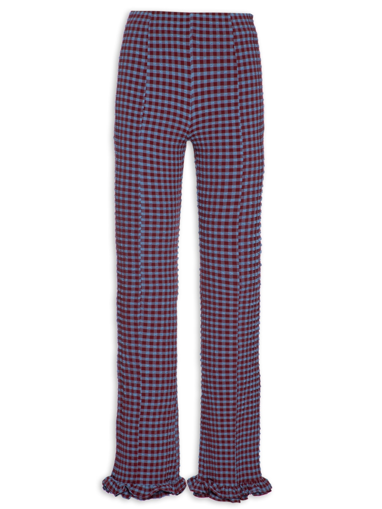 A calça vinho é confeccionada em tecido leve com superfície texturizada e média elasticidade. A peça justa ao corpo possui cintura alta, recortes, babados aplicados na barra, padronagem xadrez em tons contrastantes, comprimento longo e fechamento lateral em zíper invisível.