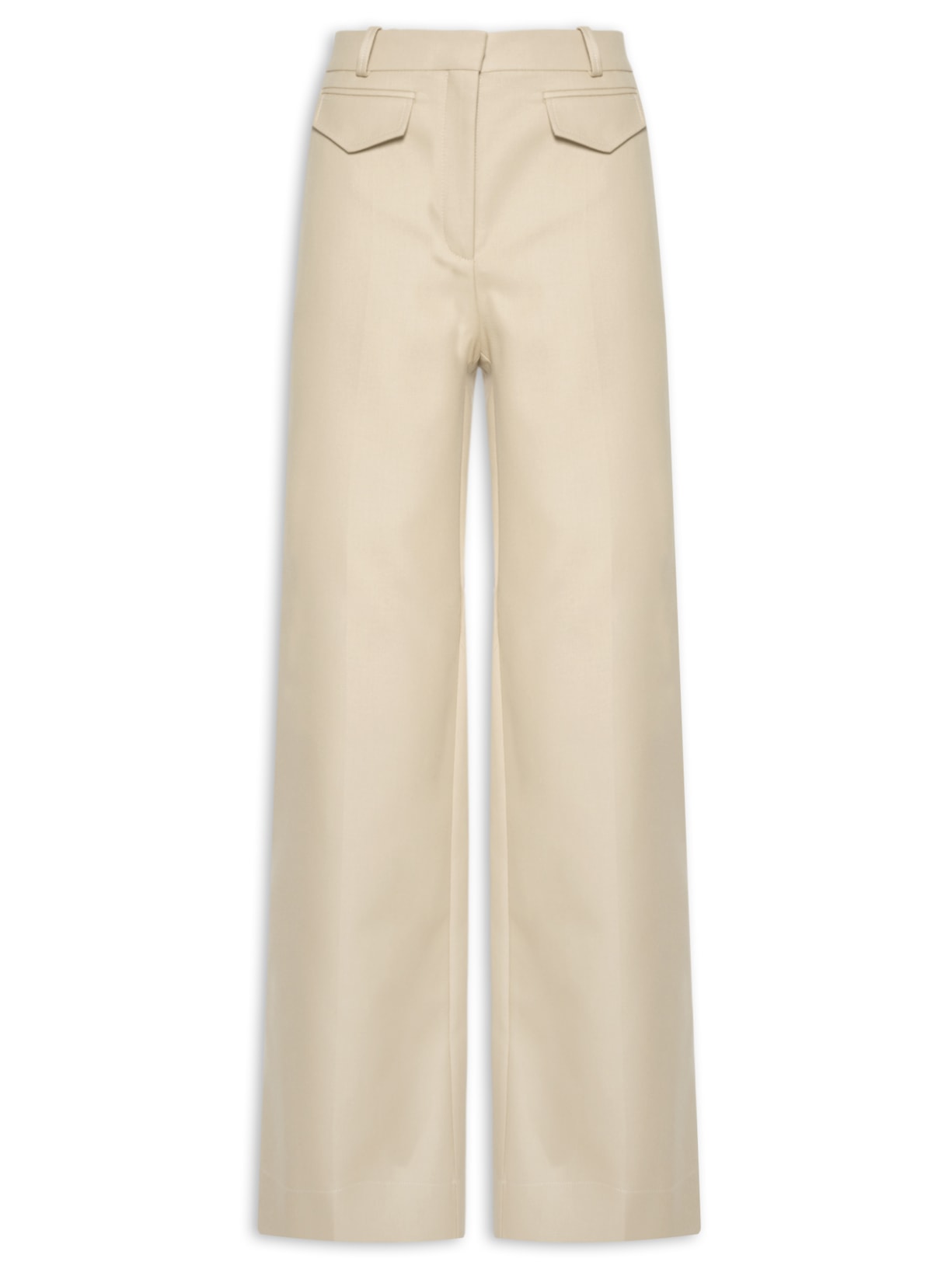 A calça bege é confeccionada em tecido encorpado sem elasticidade. A peça solta ao corpo, possui cintura alta, cós com passantes aplicados, a peça solta ao corpo, possui cintura alta, cós com passantes aplicados, bolsos frontais embutidos com abas aplicadas, bolsos faca frontais, bolsos posteriores embutidos com tag metálica da marca aplicada, comprimento longo e fechamento frontal por zíper, colchete e botão interno.