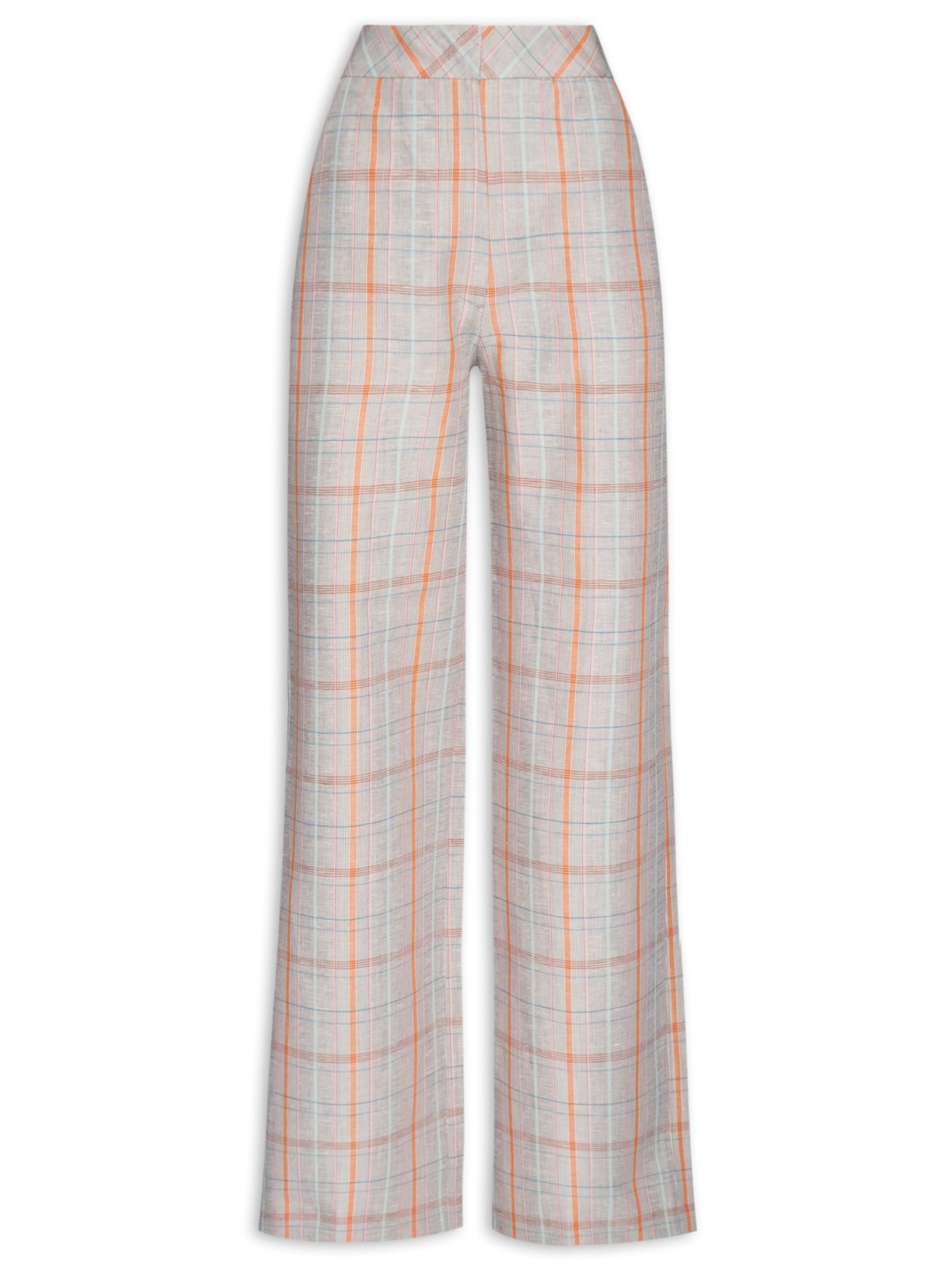A calça cinza é confeccionada em linho misto sem elasticidade. A peça solta ao corpo possui cintura alta, pences posteriores, bolsos posteriores decorativos, tag da marca aplicada em metal na parte posterior, bolsos frontais modelo faca, padronagem xadrez em cores contrastantes, comprimento longo e fechamento frontal por botão, colchete e zíper.