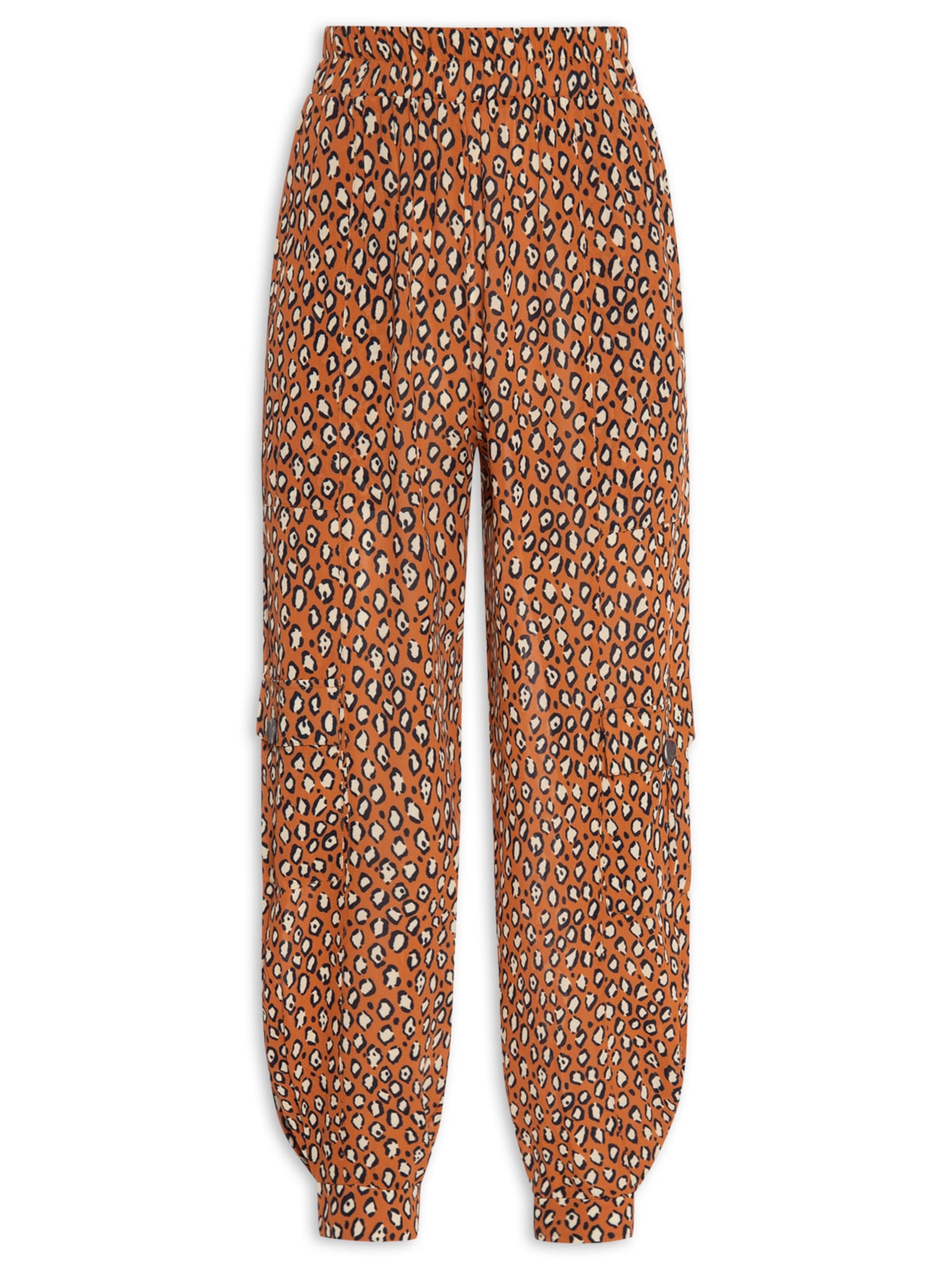 A calça animal print é confeccionada em tecido leve com superfície texturizada. A peça possui cintura alta, cós cm elástico embutido, bolsos frontais de modelo faca, bolsos laterais com detalhes de pregas e fechamento por abas sobrepostas e botões, barras com elásticos embutidos e pregas laterais e shape solto.