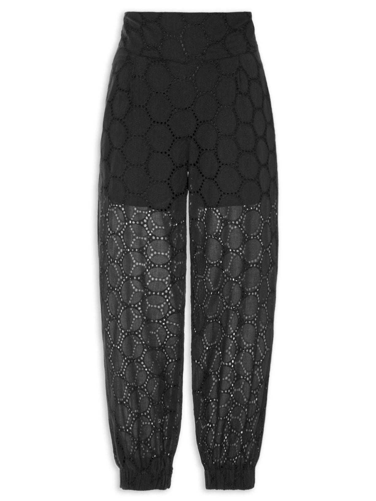 A calça preta é confeccionada em laise sem elasticidade. A peça solta ao corpo possui cintura alta, cós estendido, pregas frontais, tag metalizada com o nome da marca em baixo relevo, bolsos embutidos nas laterais, elástico embutido na barra, transparência, forro curto, e fechamento lateral em zíper.