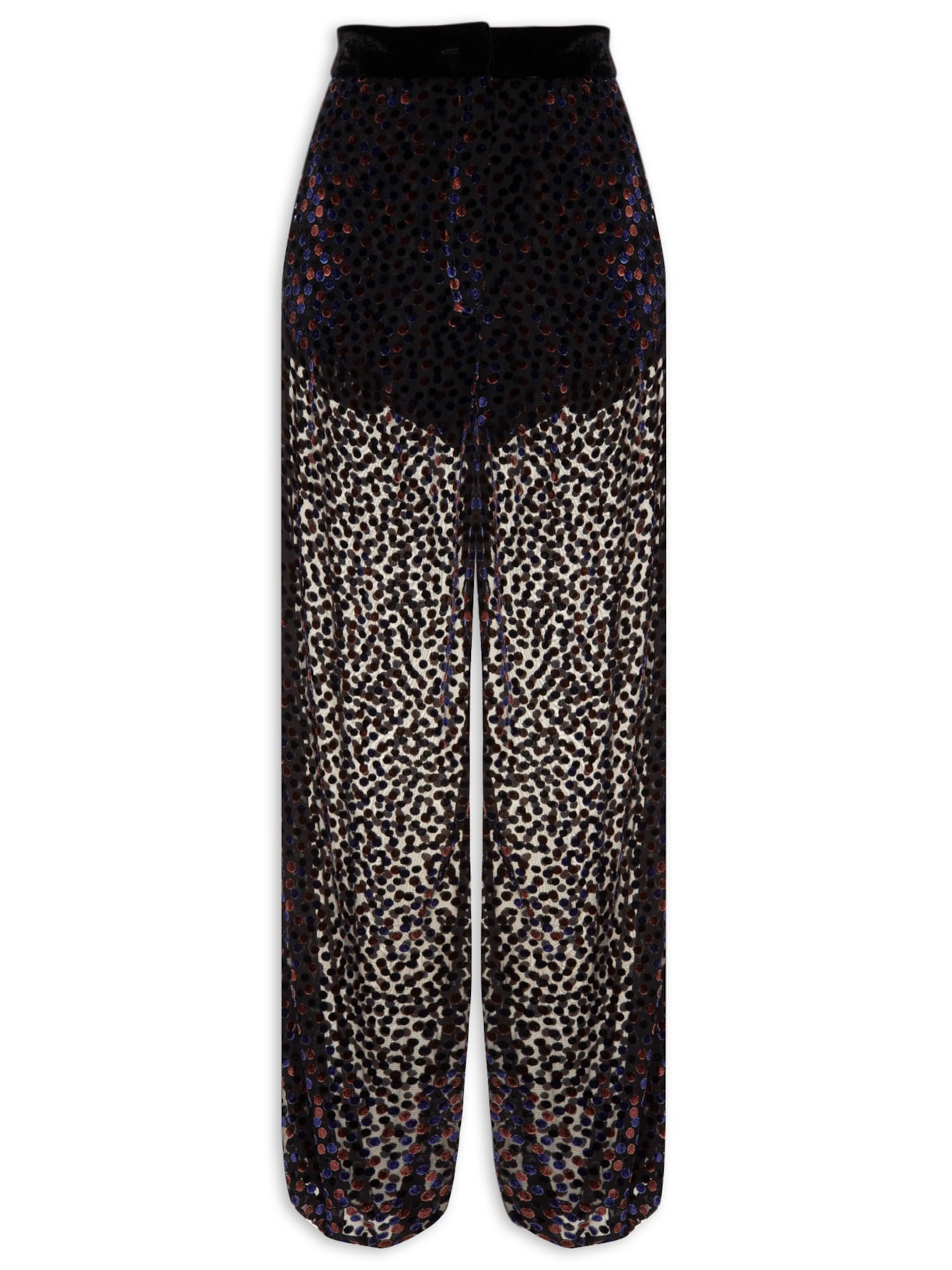 A calça preta é confeccionada em tule. A peça possui cintura alta, cós com elástico aplicado na parte posterior do cós, bolsos frontais modelo faca, elástico na barra, padronagem de poás com superfície flocada e cores contrastantes, comprimento longo, transparência, shape solto, caimento reto, acabamento pespontado e fechamento frontal por zíper e botão.