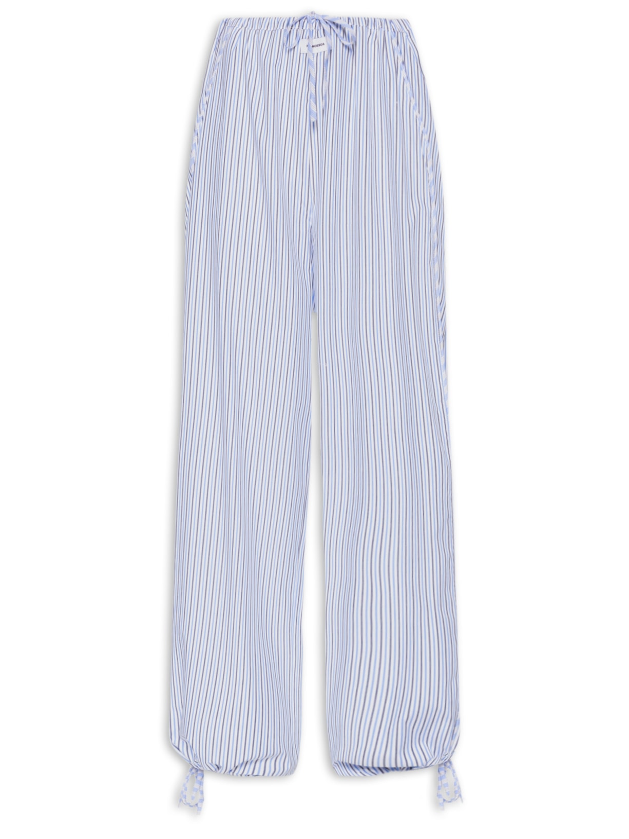 A calça azul é confeccionada em tecido leve sem elasticidade. A peça solta ao corpo possui cintura alta, cós com cordão alongado embutido para ajuste e amarração frontal, bolsos frontais de modelo faca, recorte frontal com aplicação de vivo, bolsos posteriores decorativos, tag da marca aplicada na parte frontal, barra com cordão alongado embutido para ajuste e amarração, padronagem listrada em cores contrastantes e comprimento longo.