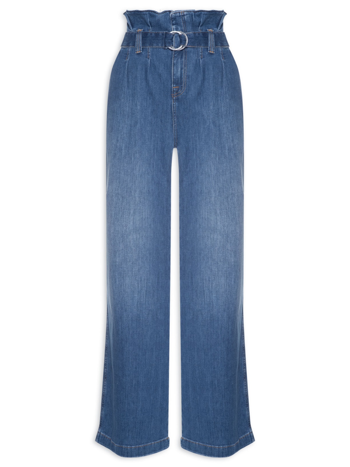 A calça azul é confeccionada em sarja com lavagem em jeans. A peça dE modelo wide leg* possui cintura alta, cós com pregas e passantes aplicados, bolsos frontais do modelo faca, bolsos posteriores, tag da marca bordada no bolso posterior, rebites, comprimento longo, lavagem estonada, shape solto, caimento reto, acabamento pespontado e fechamento frontal por botão e zíper. Acompanha faixa do mesmo material e cor para uso opcional na cintura.