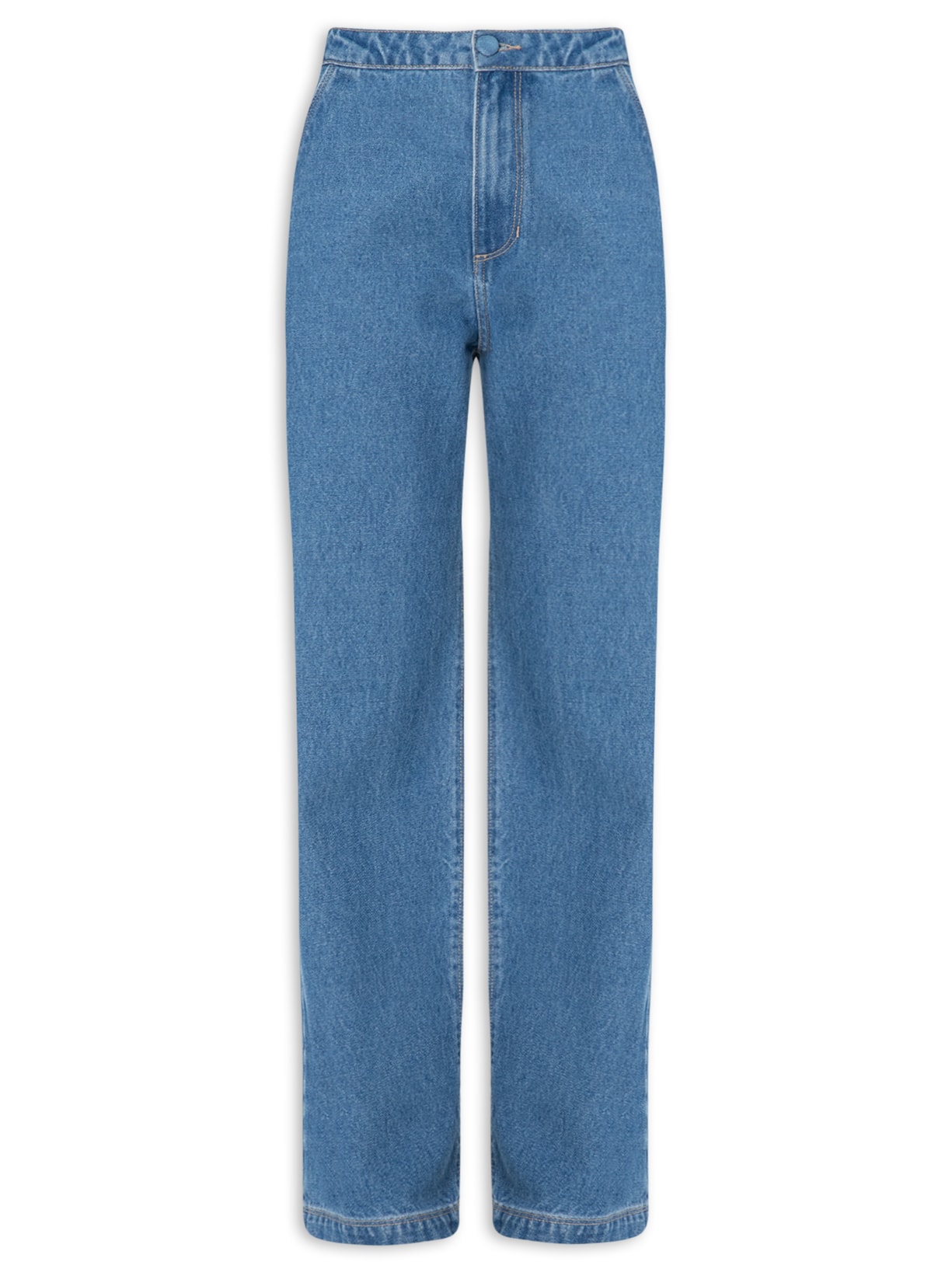 A calça azul é confeccionada em sarja com lavagem em jeans sem elasticidade. A peça solta ao corpo possui cintura alta, pences posteriores, bolsos posteriores, bolsos frontais modelo faca, comprimento longo e fechamento frontal por botão forrado e zíper.