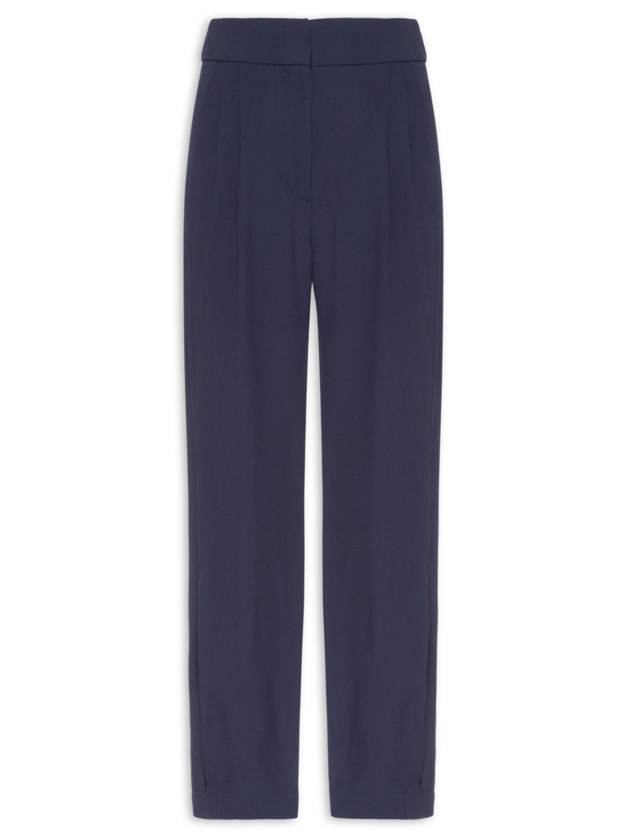 A calça azul marinho é confeccionada em crepe sem elasticidade. A peça solta ao corpo possui cintura alta, cós médio, bolsos frontais modelo faca, bolsos posteriores, pregas frontais, detalhe de recorte frontal com vinco aplicado na barra, comprimento cropped* e fechamento frontal por zíper e colchetes.