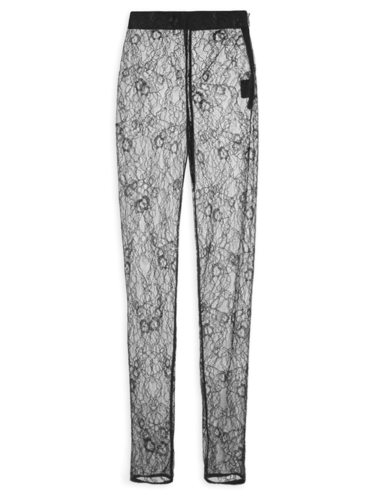As peças em renda deixam a delicadeza de lado e surgem em formas exageradas nesta estação. Aposte nesta calça da NK co um top preto, hot pants, blusa de renda, sandálias pretas, brincos chamativos, e um blazer elegante