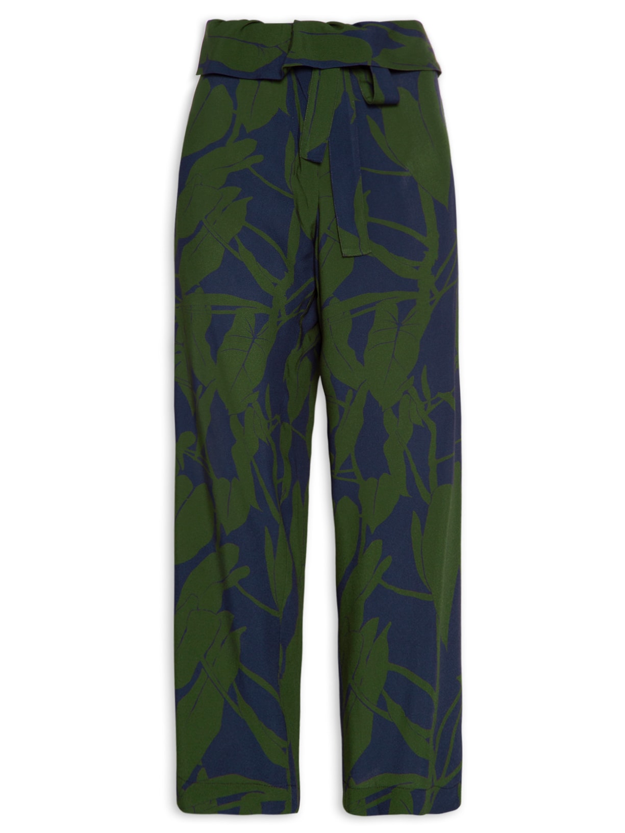 A calça azul é confeccionada em tecido leve. A peça solta ao corpo possui cintura alta, cós com pala sobreposta, estampa abstrata na cor azul e comprimento longo.