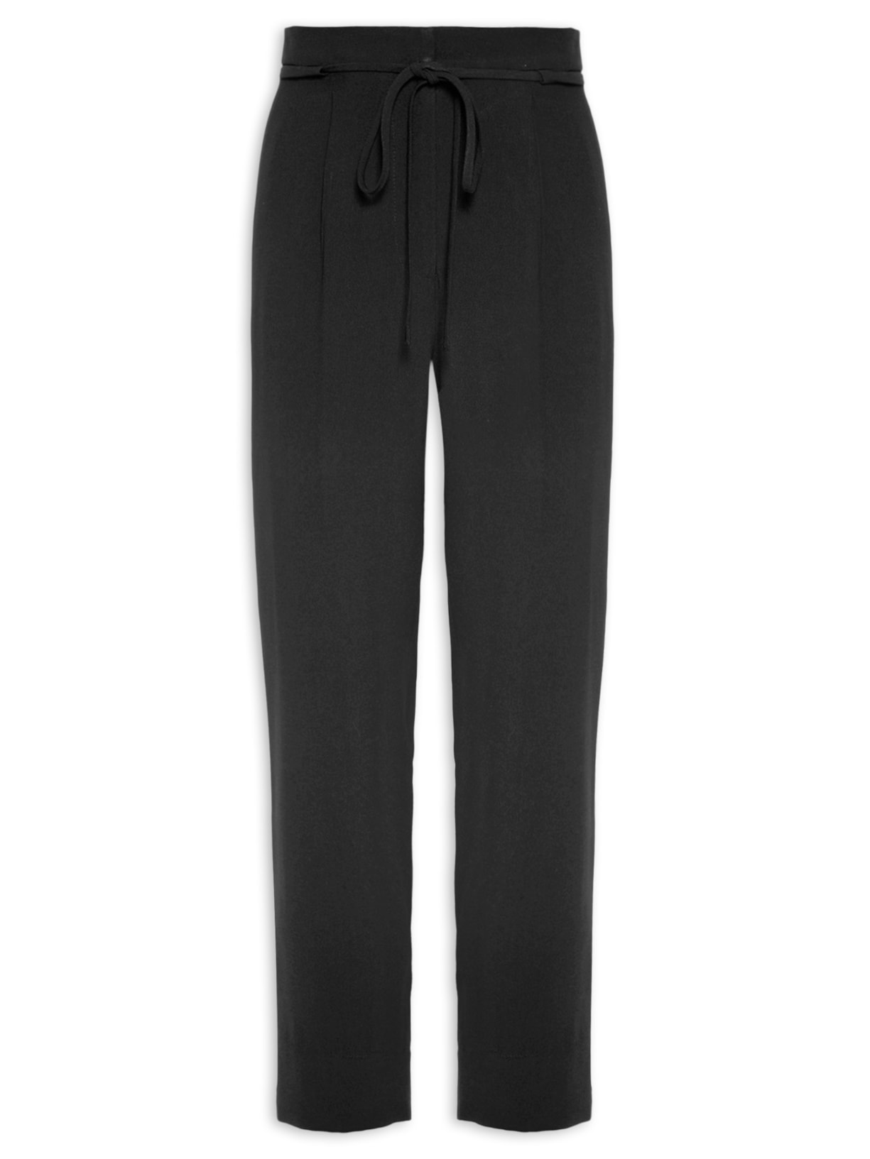 A calça preta é confeccionada em tecido leve. A peça possui cintura alta, cordão embutido na altura do cós para amarração frontal e detalhe de pregas, bolsos frontais modelo faca, pences posteriores, comprimento cropped*, shape solto, caimento reto, acabamento pespontado e fechamento frontal por colchete e zíper.