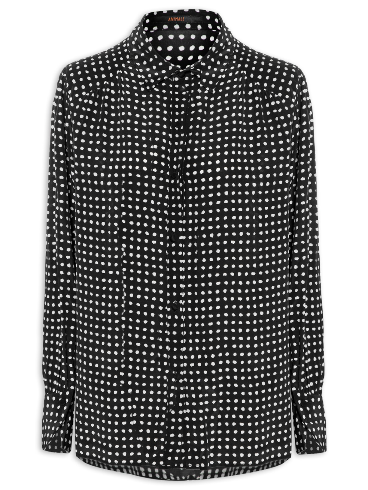 A camisa preta é confeccionada em tecido de seda sem elasticidade. A peça solta ao corpo possui colarinho francês, mangas longas, punho afunilado com abotoamento, recortes nos ombros com forro aplicado, detalhe franzido frontal, estampa de poá em formato irregular, comprimento longo e fechamento frontal por botões forrados.