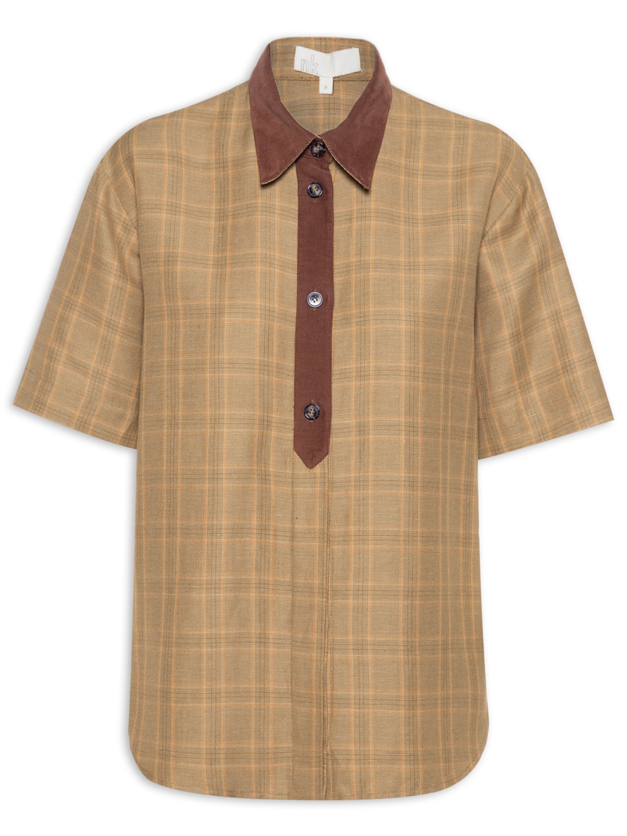 A camisa marrom é confeccionada em tecido leve com toque de linho sem elasticidade. A peça solta ao corpo possui colarinho clássico, mangas curtas, ombros estendidos, recorte posterior, colarinho e detalhe frontal em cotelê com tom contrastante, padronagem xadrez em cor contrastante, comprimento alongado, barra arredondada e fechamento frontal por botões.