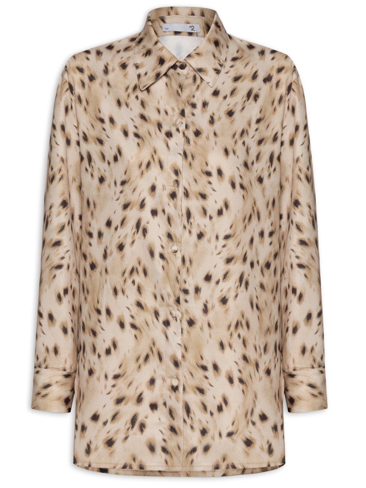 A camisa animal print é confeccionada em tecido leve sem elasticidade. A peça solta ao corpo possui colarinho clássico, mangas longas com abotoamento nos punhos, fendas laterais, comprimento alongado e fechamento frontal por botões.