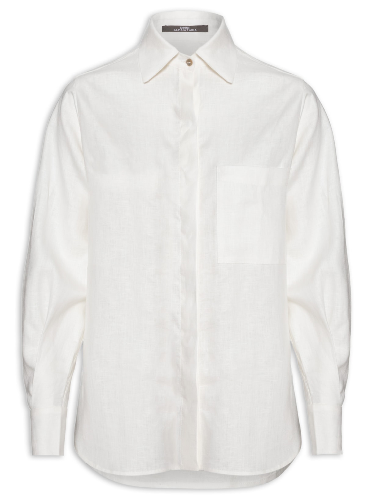 A camisa branca é confeccionada em linho sem elasticidade. A peça solta ao corpo possui colarinho clássico com abotoamento, ombros estendidos, mangas longas com abotoamento nos punhos, barra mullet* arredondada, leve transparência e fechamento frontal em botões.