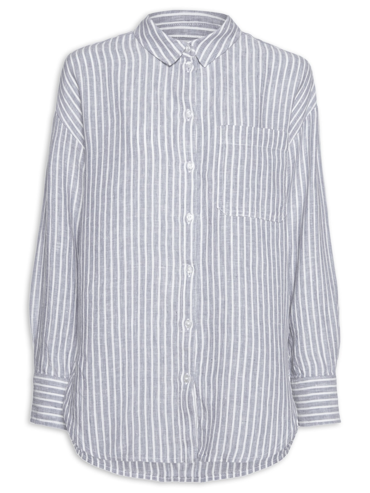 A camisa azul é confeccionada por linho sem elasticidade. A peça solta ao corpo possui colarinho simples, mangas longas com ajuste nos punhos por botão, ombros estendidos, bolso frontal na altura do busto, barra com acabamento arredondado, padronagem listrada em cor contrastante, recorte posterior com prega aplicada e fechamento por zíper e botão frontal.