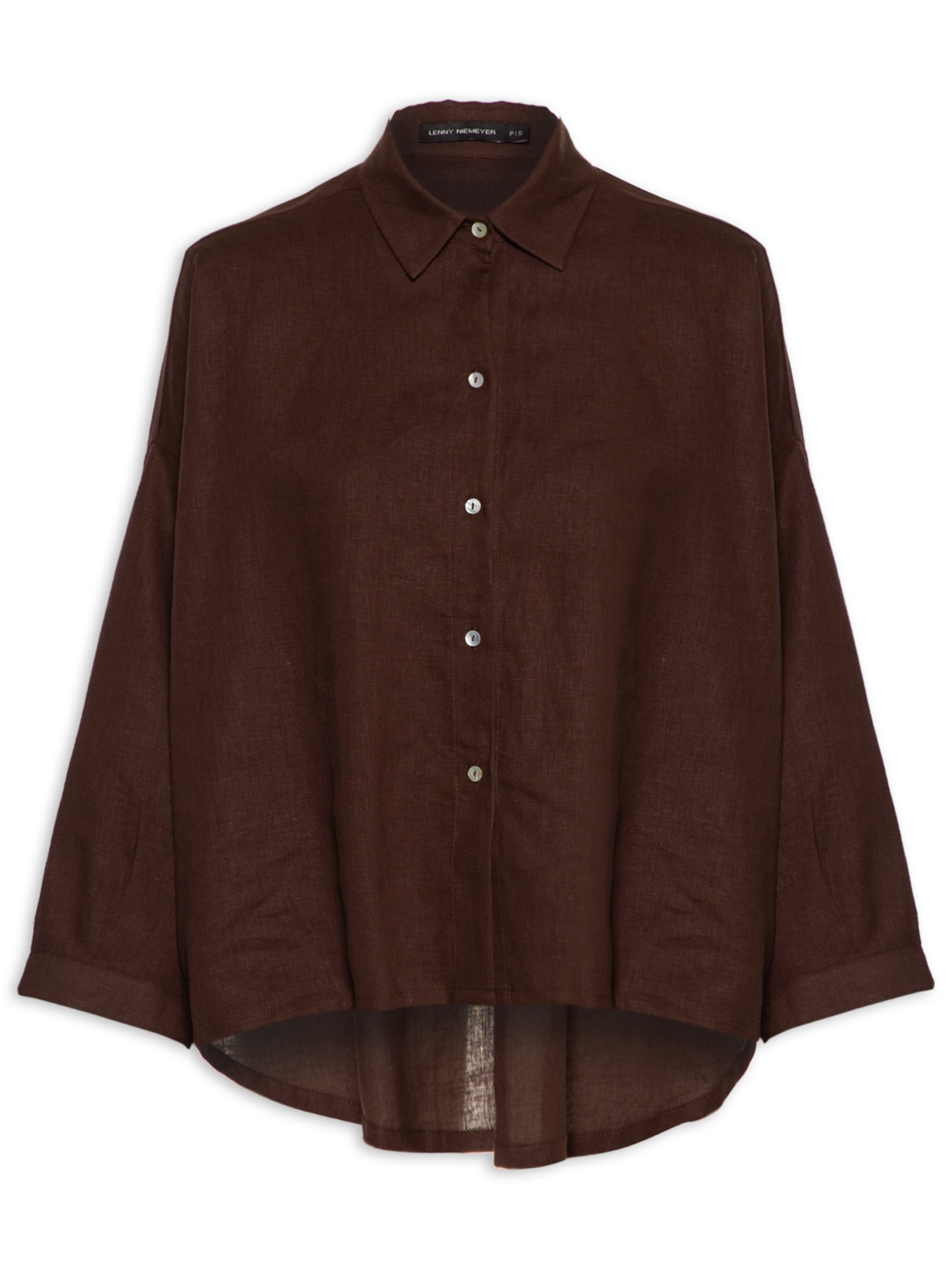 A camisa marrom é confeccionada em linho misto. A peça possui colarinho simples, ombros estendidos, mangas longas com detalhe de pregas e abotoamento nos punhos, recorte posterior com detalhe de regas, barra mullet* arredondada, shape amplo, caimento reto, acabamento pespontado e fechamento frontal por botões.