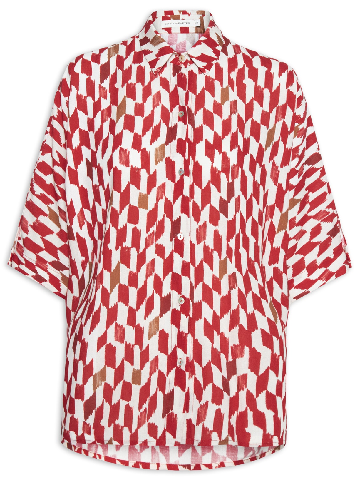 A camisa vermelha é confeccionada em tecido leve com toque de linho sem elasticidade. A peça solta ao corpo, possui colarinho clássico, mangas 3/4 japonesas com abotoamento, pregas posteriores, estampa geométrica em cores contrastantes, barra mullet* arredondada e fechamento frontal por botões.
