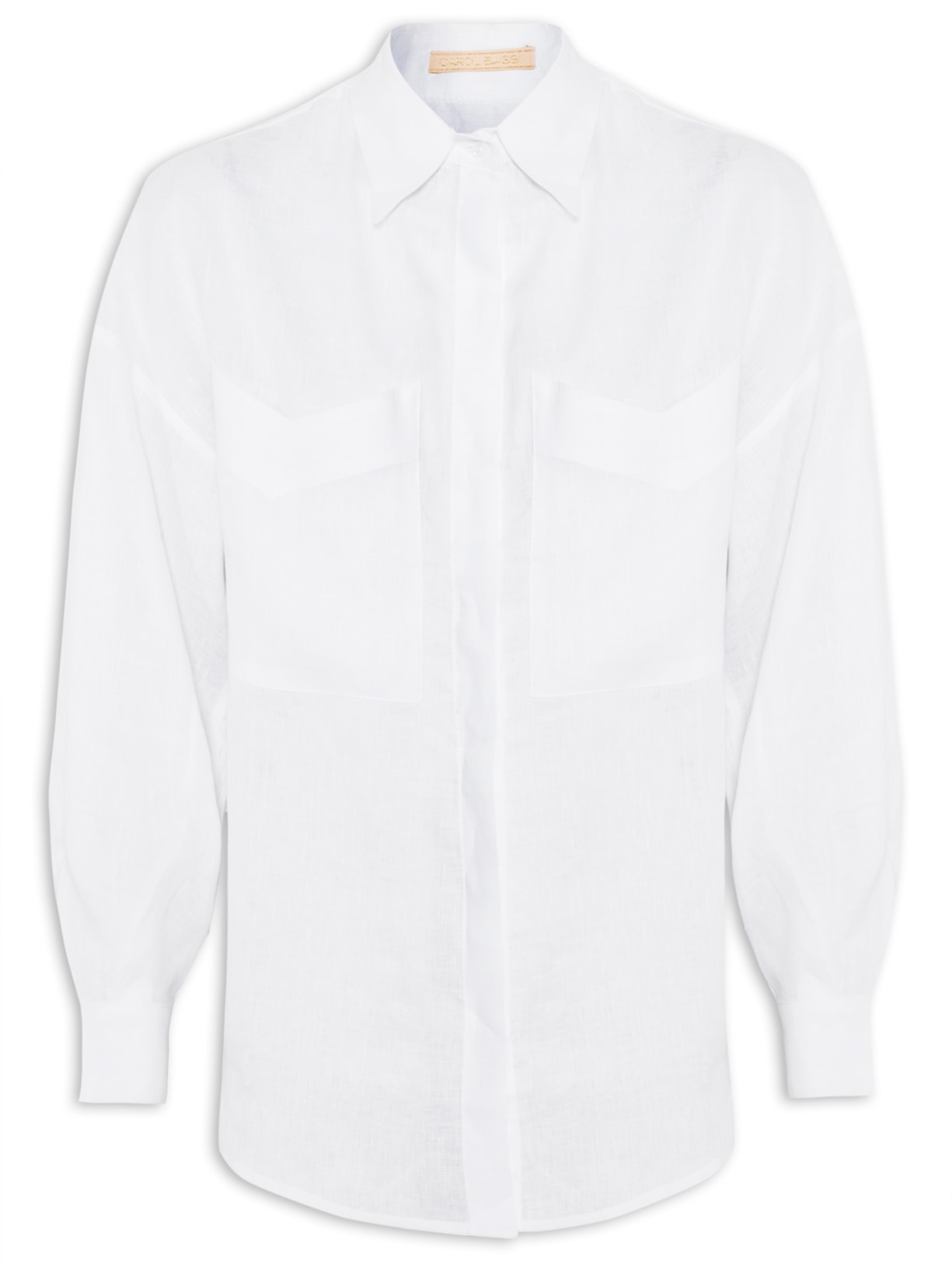 A camisa branca é confeccionada em linho. A peça possui colarinho francês, mangas longas com abotoamento nos punhos, ombros estendidos, bolsos frontais aplicados na altura do busto, recortes posteriores, barra arredondada, shape solto, caimento reto, acabamento pespontado e fechamento frontal por botões.