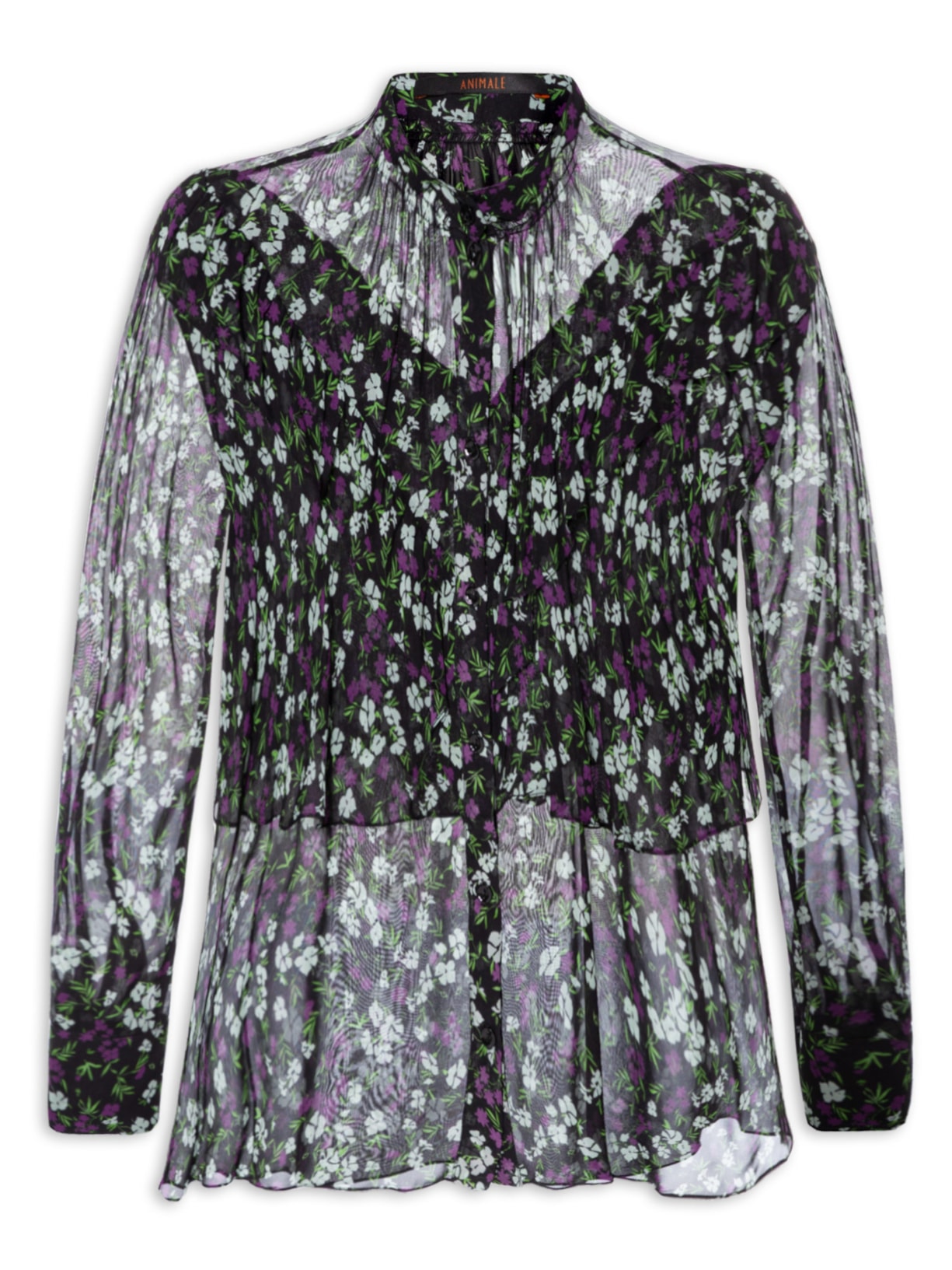 A camisa preta é confeccionada em tecido leve sem elasticidade. A peça solta ao corpo possui gola padre, mangas longas com abotoamento nos punhos, recorte posterior e frontal com babado, transparência, estampa floral em cores contrastantes e fechamento frontal por botões.