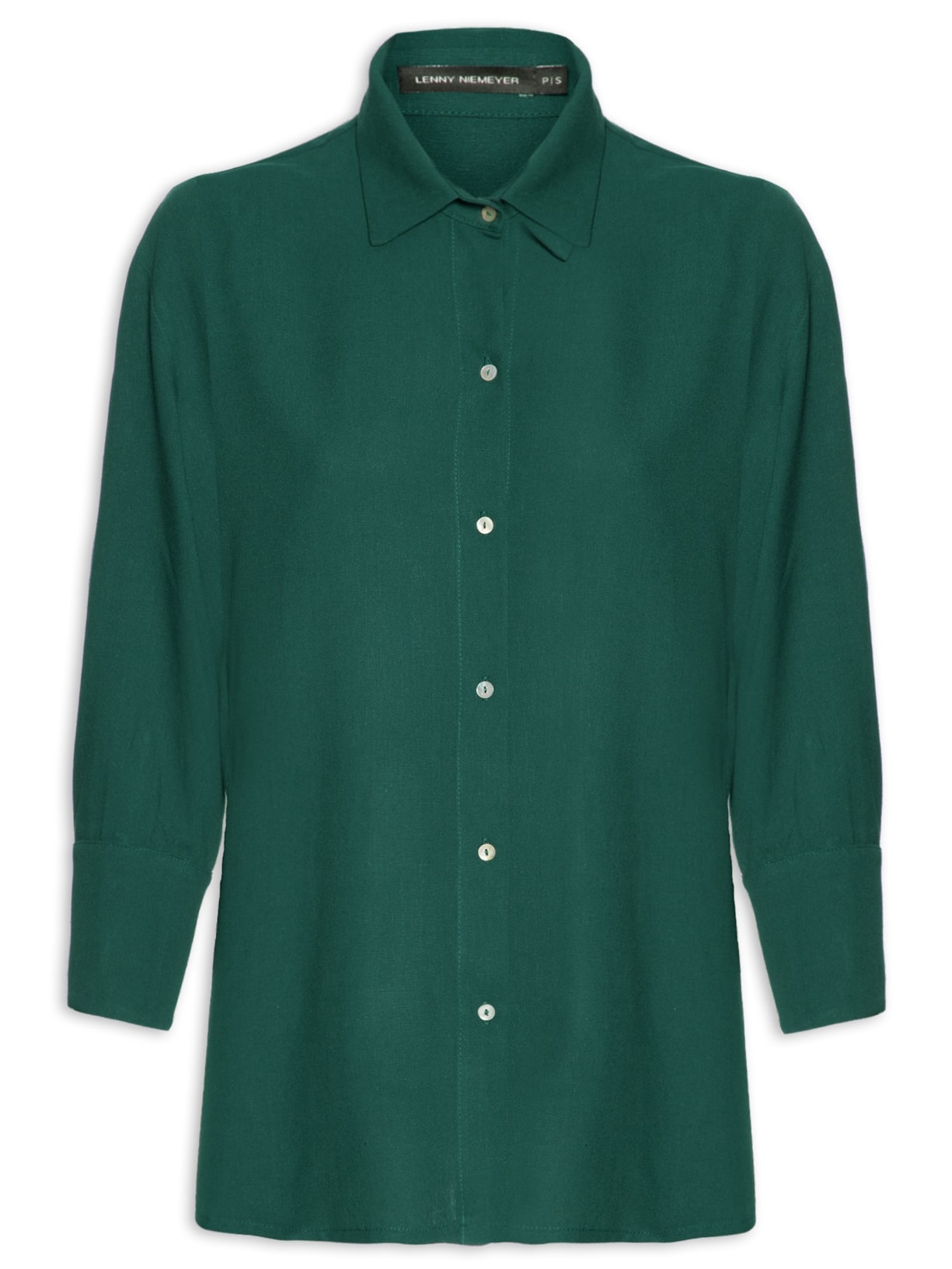 A camisa verde é confeccionada em tecido leve sem elasticidade. A peça solta ao corpo possui colarinho simples, mangas 3/4 com abotoamento nos punhos, recorte posterior com pregas, barra arredondada, comprimento alongado e fechamento frontal por botões.