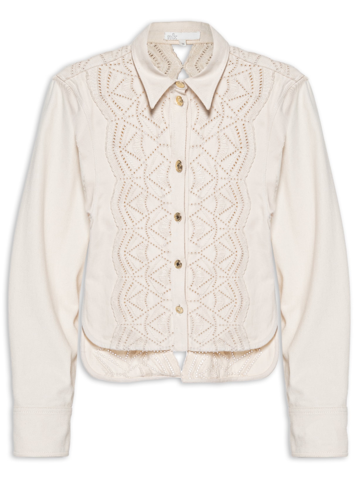 A camisa bege é confeccionada em sarja sem elasticidade. A peça solta ao corpo possui colarinho clássico, mangas longas com abotoamento nos punhos, recortes posteriores vazados, bordados nas partes posterior e frontal, barra mullet* e fechamento frontal por botões.
