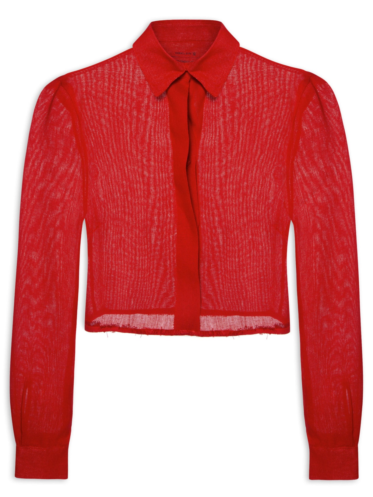 A camisa vermelha é confeccionada em linho misto sem elasticidade. A peça solta ao corpo, possui colarinho clássico, mangas longas com abotoamento e pregas nos punhos, leve transparência, barra com detalhe desfiado, comprimento cropped* e fechamento frontal por botões com vista sobreposta.