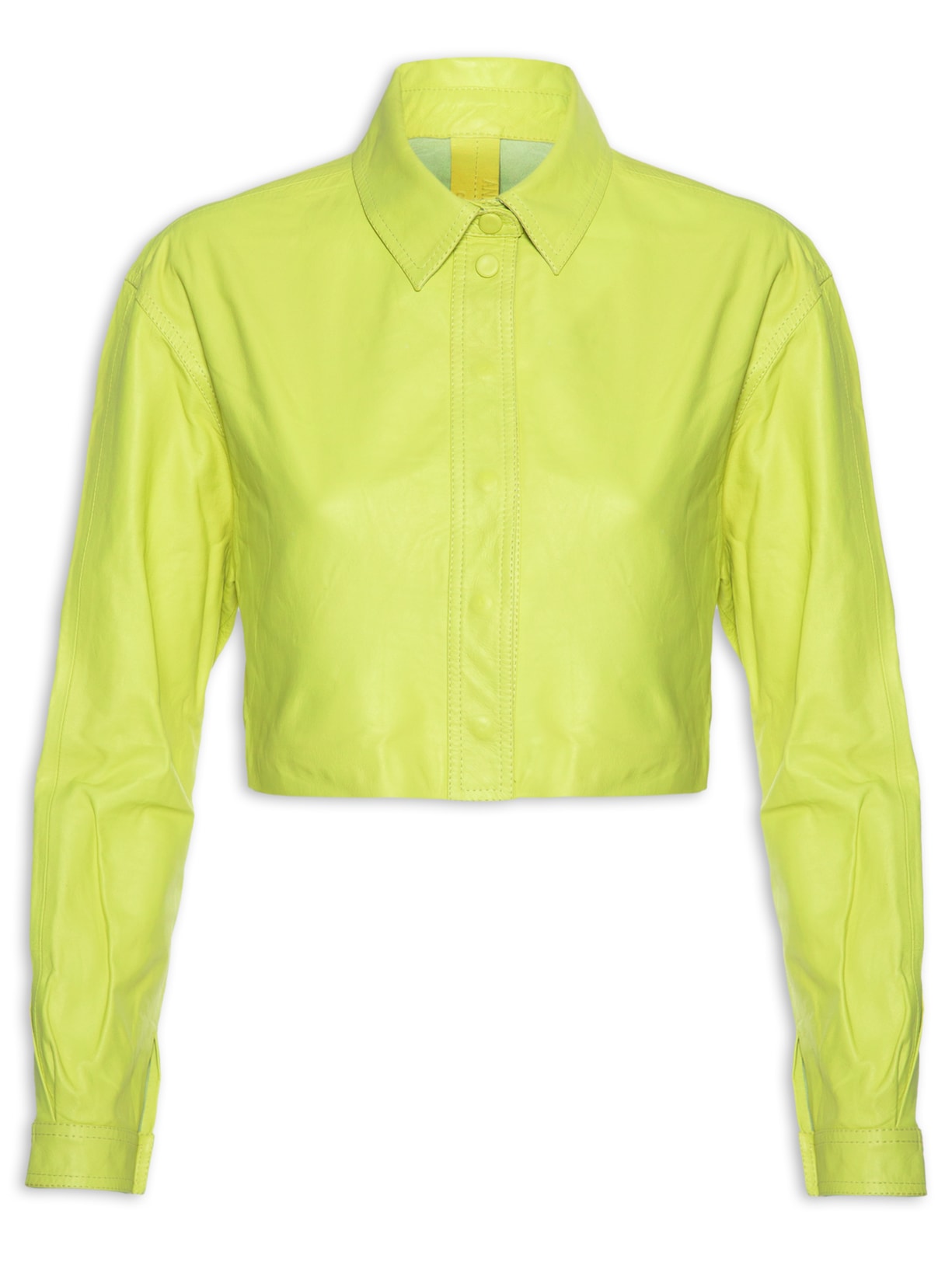 A camisa verde é confeccionada em couro. A peça possui colarinho clássico, ombros estendidos, mangas longas com detalhes de pregas e abotoamento nos punhos, recortes posteriores, comprimento cropped*, shape solto, caimento reto, acabamento pespontado e fechamento frontal por botões de pressão.