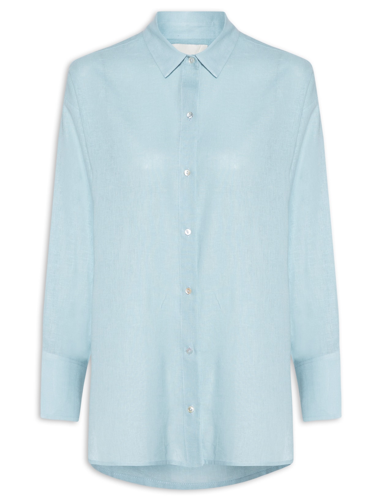 A camisa azul é confeccionada em linho misto sem elasticidade. A peça solta ao corpo possui colarinho clássico, ombros estendidos, mangas longas com abotoamento nos punhos, barra arredondada, leve transparência e fechamento frontal por botões.
