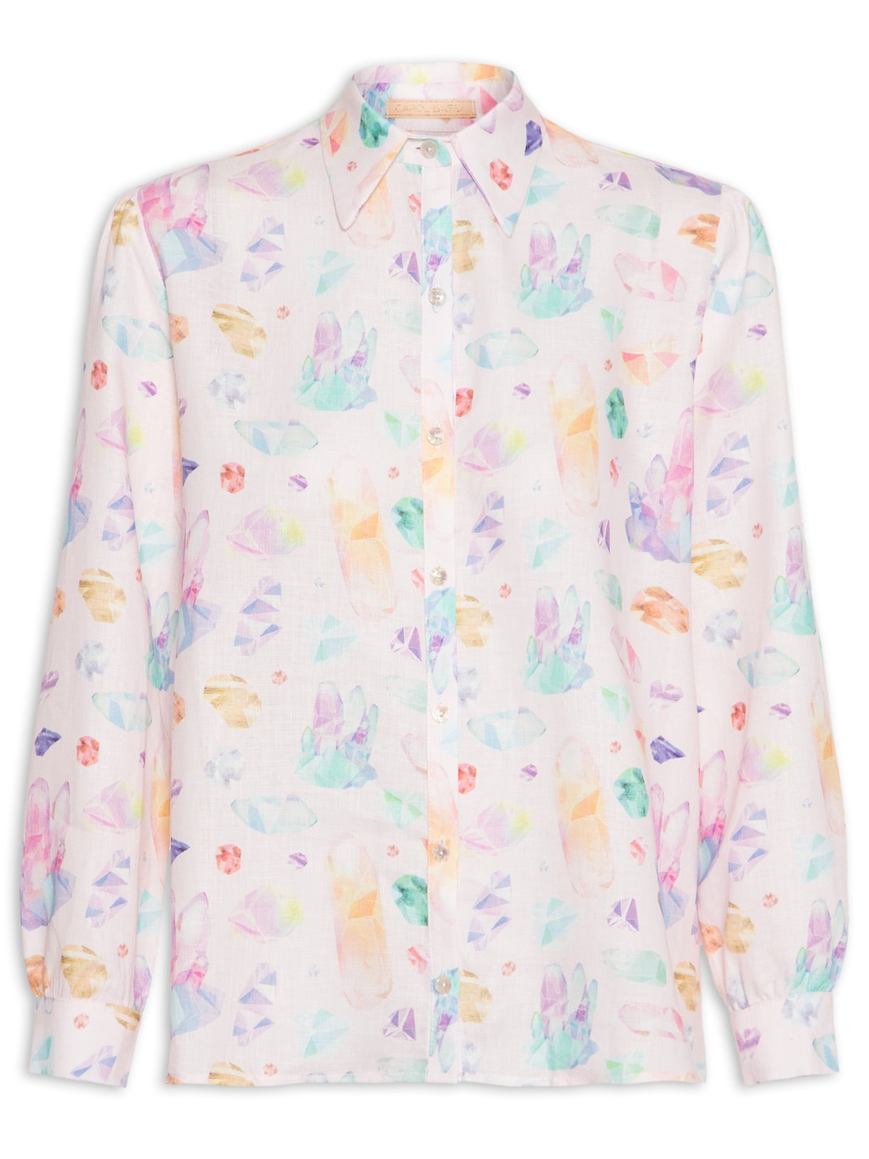 A camisa rosa é confeccionada em linho. A peça possui colarinho francês, mangas longas com abotoamento nos punhos, estampa figurativa de pedras preciosas em tons contrastantes, barra arredondada, caimento reto, shape solto, acabamento pespontado e fechamento frontal por botões.