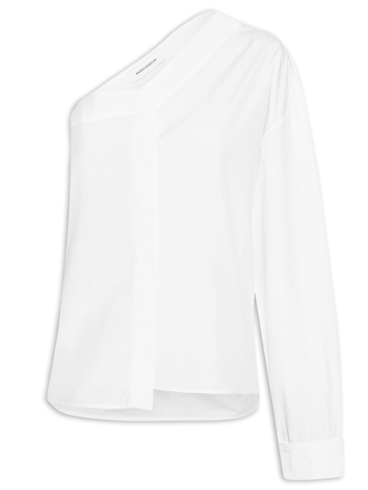 A camisa off white é confeccionada em tecido leve sem elasticidade. A peça solta ao corpo possui decote assimétrico, manga longa com abotoamento no punho, ombro estendido e fechamento frontal por botões com vista sobreposta.